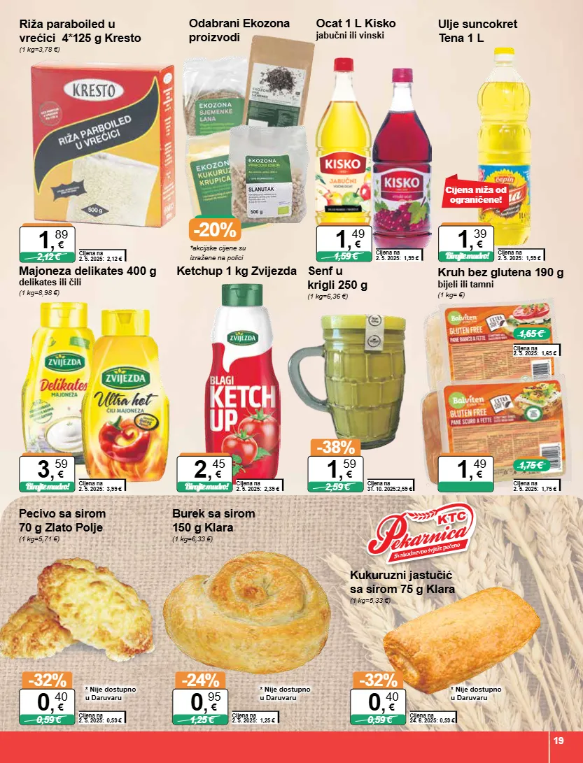 cijena na 2. 5. 2025: 3,99 € cijena na 2. 5. 2025: 2,39 € cijena na 2. 5. 2025: 0,59 € cijena na 2. 5. 2025: 1,25 € cijena na 24. 6. 2025: 0,59 € cijena na 2. 5. 2025: 2,12 € cijena na 2. 5. 2025: 1,99 € cijena na 31. 10. 2025:2,59 € cijena na 2. 5. 2025: 1,59 € cijena na 2. 5. 2025: 1,65 € cijena na 2. 5. 2025: 1,75 € *akcijske cijene su izražene na polici -20% p p ekarnica ekarnica kt ktc c p ekarnica ktc * nije dostupno u daruvaru * nije dostupno u daruvaru * nije dostupno u daruvaru majoneza delikates 400 g delikates ili čili (1 kg=8,98 €) birajte mudro! 3 , 59 € ketchup 1 kg zvijezda birajte mudro! 2 , 45 € pecivo sa sirom 70 g zlato polje (1 kg=5,71 €) -32% 0,59 € 0 , 40 € burek sa sirom 150 g klara (1 kg=6,33 €) -24% 1,25 € 0 , 95 € kukuruzni jastučić sa sirom 75 g klara (1 kg=5,33 €) -32% 0,59 € 0 , 40 € riža paraboiled u vrećici 4*125 g kresto (1 kg=3,78 €) 2,12 € 1 , 89 € ocat 1 l kisko jabučni ili vinski 1,59 € 1 , 49 € senf u krigli 250 g (1 kg=6,36 €) -38% 2,59 € 1 , 59 € cijena niža od ograničene! ulje suncokret tena 1 l birajte mudro! 1 , 39 € kruh bez glutena 190 g bijeli ili tamni (1 kg= €) 1 , 49 € 1,65 € 1,75 € odabrani ekozona proizvodi 19