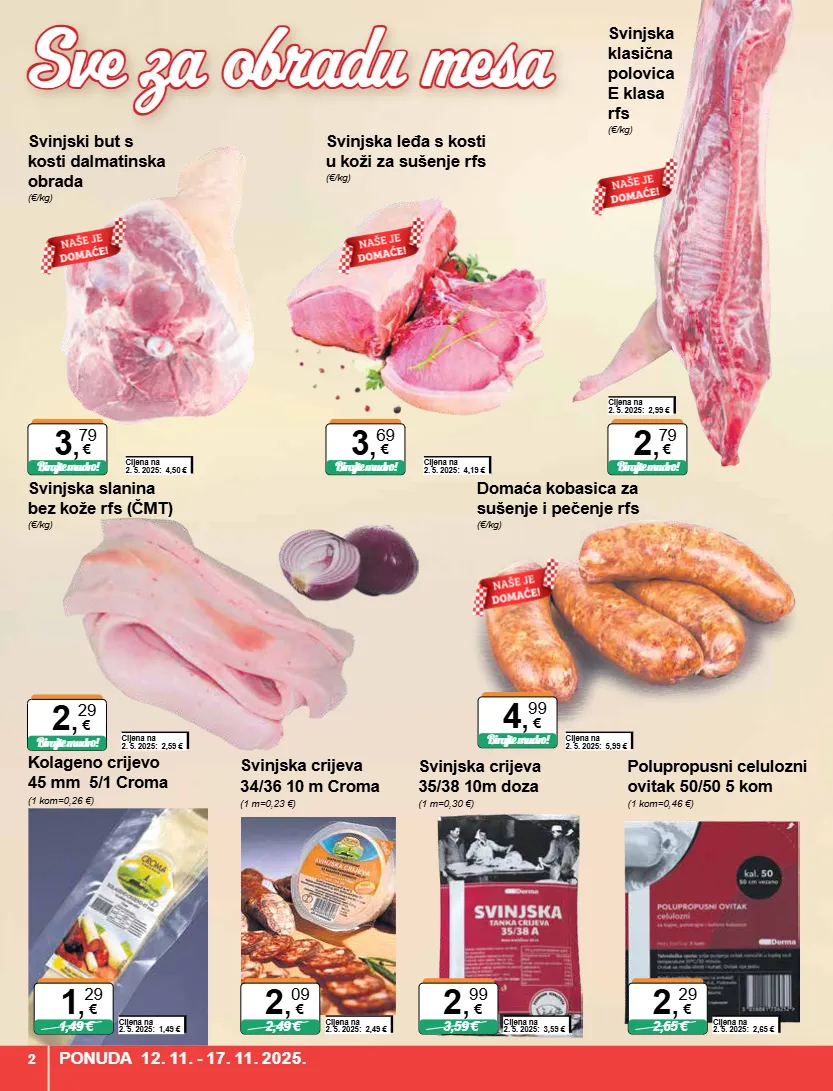 cijena na 2. 5. 2025: 3,59 € cijena na 2. 5. 2025: 2,65 € cijena na 2. 5. 2025: 2,49 € cijena na 2. 5. 2025: 1,49 € cijena na 2. 5. 2025: 2,99 € cijena na 2. 5. 2025: 4,19 € cijena na 2. 5. 2025: 4,50 € cijena na 2. 5. 2025: 2,59 € cijena na 2. 5. 2025: 5,99 € svinjska crijeva 35/38 10m doza (1 m=0,30 €) polupropusni celulozni ovitak 50/50 5 kom (1 kom=0,46 €) svinjska crijeva 34/36 10 m croma (1 m=0,23 €) kolageno crijevo 45 mm 5/1 croma (1 kom=0,26 €) 3,59 € 2 , 99 € 2,65 € 2 , 29 € 2,49 € 2 , 09 € 1,49 € 1 , 29 € svinjska leđa s kosti u koži za sušenje rfs (€/kg) domaća kobasica za sušenje i pečenje rfs (€/kg) svinjska klasična polovica e klasa rfs (€/kg) svinjski but s kosti dalmatinska obrada (€/kg) svinjska slanina bez kože rfs (čmt) (€/kg) birajte mudro! 2 , 79 € birajte mudro! 3 , 79 € birajte mudro! 4 , 99 € birajte mudro! 2 , 29 € birajte mudro! 3 , 69 € ponuda 12. 11. - 17. 11. 2025. 2 sve za obradu mesa sve za obradu mesa