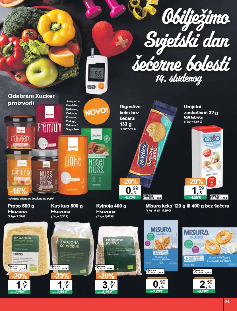 *akcijske cijene su izražene na polici -15% Cijena na 3. 11. 2025: 1,25 € Cijena na 2. 5. 2025: 1,46 € Cijena na 2. 5. 2025: 3,85 € Cijena na 2. 5. 2025: 1,99 € Cijena na 2. 5. 2025: 2,19 € Cijena na 2. 5. 2025: 2,59 € Cijena na 2. 5. 2025: 2,59 € NOVO! dostupno u Varaždinu, Bjelovaru, Karlovcu, Vrbovcu, Prelogu, Pakracu i Dugo Selo Odabrani Xucker proizvodi Proso 500 g Ekozona (1 kg= 3,50 €) Kus kus 500 g Ekozona (1 kg= 3,98 €) Kvinoja 400 g Ekozona (1 kg= 8,48 €) Digestive keks bez šećera 133 g (1 kg=7,44 €) Misura keks 120 g ili 400 g bez šećera (1 kg= 6,48 - 8,25 €) 1,20 € 0 , 99 € 3,19 € 2 , 59 € Umjetni zaslađivač 32 g 650 tableta (1 kg=49,69 €) -20% 1,99 € 1 , 59 € -20% 1,25 € 0 , 99 € -20% 2,19 € 1 , 75 € -23% 2,59 € 1 , 99 € -20% 4,29 € 3 , 39 € 21 Obilježimo Svjetski dan šećerne bolesti 14. studenog