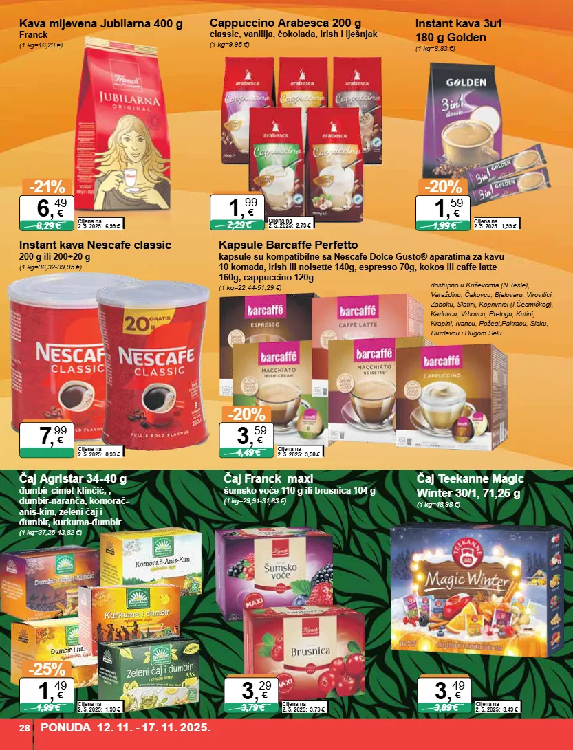 cijena na 2. 5. 2025: 3,98 € cijena na 2. 5. 2025: 6,99 € cijena na 2. 5. 2025: 8,99 € cijena na 2. 5. 2025: 1,99 € cijena na 2. 5. 2025: 2,79 € cijena na 2. 5. 2025: 3,79 € cijena na 2. 5. 2025: 1,99 € cijena na 2. 5. 2025: 3,49 € kapsule barcaffe perfetto kapsule su kompatibilne sa nescafe dolce gusto® aparatima za kavu 10 komada, irish ili noisette 140g, espresso 70g, kokos ili caffe latte 160g, cappuccino 120g (1 kg=22,44-51,29 €) -20% 4,49 € 3 , 59 € kava mljevena jubilarna 400 g franck (1 kg=16,23 €) -21% 8,29 € 6 , 49 € instant kava nescafe classic 200 g ili 200+20 g (1 kg=36,32-39,95 €) 7 , 99 € instant kava 3u1 180 g golden (1 kg=8,83 €) -20% 1,99 € 1 , 59 € cappuccino arabesca 200 g classic, vanilija, čokolada, irish i lješnjak (1 kg=9,95 €) 2,29 € 1 , 99 € dostupno u križevcima (n.tesle), varaždinu, čakovcu, bjelovaru, virovitici, zaboku, slatini, koprivnici (i.česmičkog), karlovcu, vrbovcu, prelogu, kutini, krapini, ivancu, požegi,pakracu, sisku, đurđevcu i dugom selu čaj franck maxi šumsko voće 110 g ili brusnica 104 g (1 kg=29,91-31,63 €) 3,79 € 3 , 29 € čaj agristar 34-40 g đumbir-cimet-klinčić, , đumbir-naranča, komorač- anis-kim, zeleni čaj i đumbir, kurkuma-đumbir (1 kg=37,25-43,82 €) -25% 1,99 € 1 , 49 € čaj teekanne magic winter 30/1, 71,25 g (1 kg=48,98 €) 3,89 € 3 , 49 € ponuda 12. 11. - 17. 11. 2025. 28