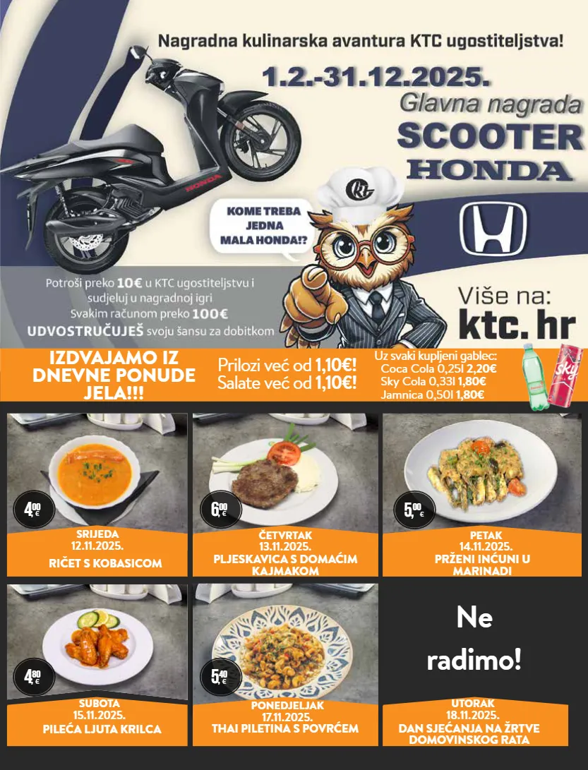 kn četvrtak 13.11.2025. zelena tjestenina s plodovima mora utorak 18.11.2025. ponedjeljak 17.11.2025. subota 15.11.2025. thai piletina s povrćem dan sjećanja na žrtve domovinskog rata pileća ljuta krilca izdvajamo iz dnevne ponude jela!!! petak 14.11.2025. prženi inćuni u marinadi 4 , 00 € 6 , 00 € 4 , 80 € 5, 00 € srijeda 12.11.2025. pljeskavica s domaćim kajmakom ričet s kobasicom coca cola 0,25l 2,20€ sky cola 0,33l 1,80€ jamnica 0,50l 1,80€ prilozi već od 1,10€! salate već od 1,10€! uz svaki kupljeni gablec: 5 , 40 € ne radimo!