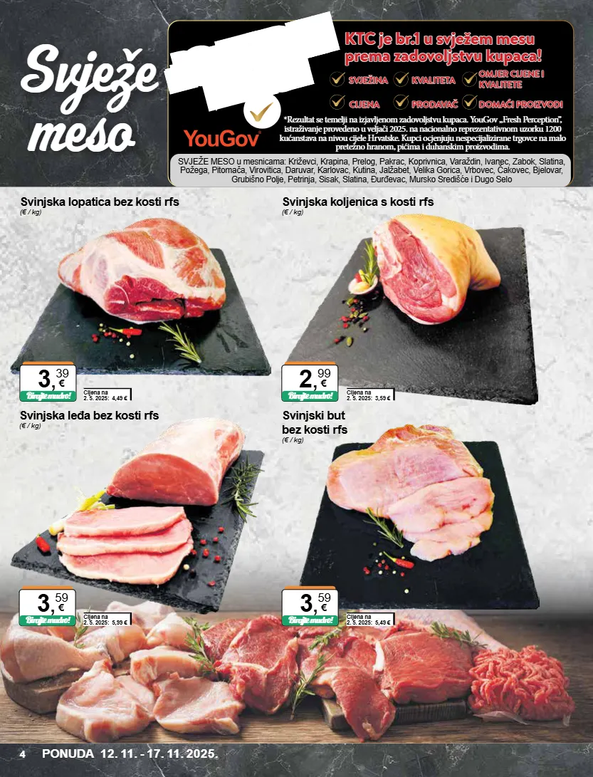 svježe meso u mesnicama: križevci, krapina, prelog, pakrac, koprivnica, varaždin, ivanec, zabok, slatina, požega, pitomača, virovitica, daruvar, karlovac, kutina, jalžabet, velika gorica, vrbovec, čakovec, bjelovar, grubišno polje, petrinja, sisak, slatina, đurđevac, mursko središće i dugo selo ktc je br.1 u svježem mesu ktc je br.1 u svježem mesu prema zadovoljstvu kupaca! prema zadovoljstvu kupaca! *rezultat se temelji na izjavljenom zadovoljstvu kupaca. yougov „fresh perception”, istraživanje provedeno u veljači 2025. na nacionalno reprezentativnom uzorku 1200 kućanstava na nivou cijele hrvatske. kupci ocjenjuju nespecijalizirane trgovce na malo pretežno hranom, pićima i duhanskim proizvodima. domaći proizvodi domaći proizvodi omjer cijene i omjer cijene i kvalitete kvalitete prodavač prodavač kvaliteta kvaliteta svježina svježina cijena cijena potvrdili kupci cijena na 2. 5. 2025: 4,49 € cijena na 2. 5. 2025: 5,99 € cijena na 2. 5. 2025: 3,59 € cijena na 2. 5. 2025: 5,49 € svinjski but bez kosti rfs (€ / kg) birajte mudro! 3 , 59 € svinjska lopatica bez kosti rfs (€ / kg) svinjska koljenica s kosti rfs (€ / kg) svinjska leđa bez kosti rfs (€ / kg) birajte mudro! 3 , 39 € birajte mudro! 2 , 99 € birajte mudro! 3 , 59 € ponuda 12. 11. - 17. 11. 2025. 4 svježe meso