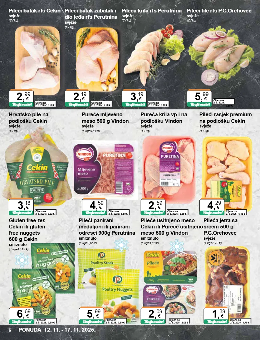 cijena na 2. 5. 2025: 2,99 € cijena na 2. 5. 2025: 3,19 € cijena na 2. 5. 2025: 7,99 € cijena na 2. 5. 2025: 3,32 € cijena na 2. 5. 2025: 3,99 € cijena na 2. 5. 2025: 5,19 € cijena na 2. 5. 2025: 2,69 € cijena na 2. 5. 2025: 5,59 € cijena na 2. 5. 2025: 3,89 € cijena na 2. 5. 2025: 7,99 € cijena na 2. 5. 2025: 7,99 € cijena na 2. 5. 2025: 1,79 € pileći batak zabatak i dio leđa rfs perutnina svježe (€ / kg) birajte mudro! 2 , 19 € pileća krila rfs perutnina svježe (€ / kg) birajte mudro! 3 , 19 € pileći panirani medaljoni ili panirani odresci 900g perutnina smrznuto (1 kg=6,65 €) birajte mudro! 5 , 99 € hrvatsko pile na podlošku cekin svježe (€ / kg) birajte mudro! 3 , 18 € pileći batak rfs cekin svježe (€ / kg) birajte mudro! 2 , 99 € pileći rasjek premium na podlošku cekin svježe (€ / kg) birajte mudro! 4 , 29 € pileće usitnjeno meso cekin ili pureće usitnjeno meso 500 g vindon smrznuto (1 kg=4,18 €) birajte mudro! 2 , 09 € pureće mljeveno meso 500 g vindon svježe (1 kg=9,18 €) birajte mudro! 4 , 59 € pureća krila vp i na podlošku vindon svježe (€ / kg) birajte mudro! 2 , 59 € gluten free-tes cekin ili gluten free nuggets 600 g cekin smrznuto (1 kg=11,15 €) birajte mudro! 6 , 69 € pileći file rfs p.g.orehovec svježe (€ / kg) birajte mudro! 5 , 99 € pileća jetra sa srcem 500 g p.g.orehovec svježe (1 kg=2,78 €) birajte mudro! 1 , 39 € ponuda 12. 11. - 17. 11. 2025. 6