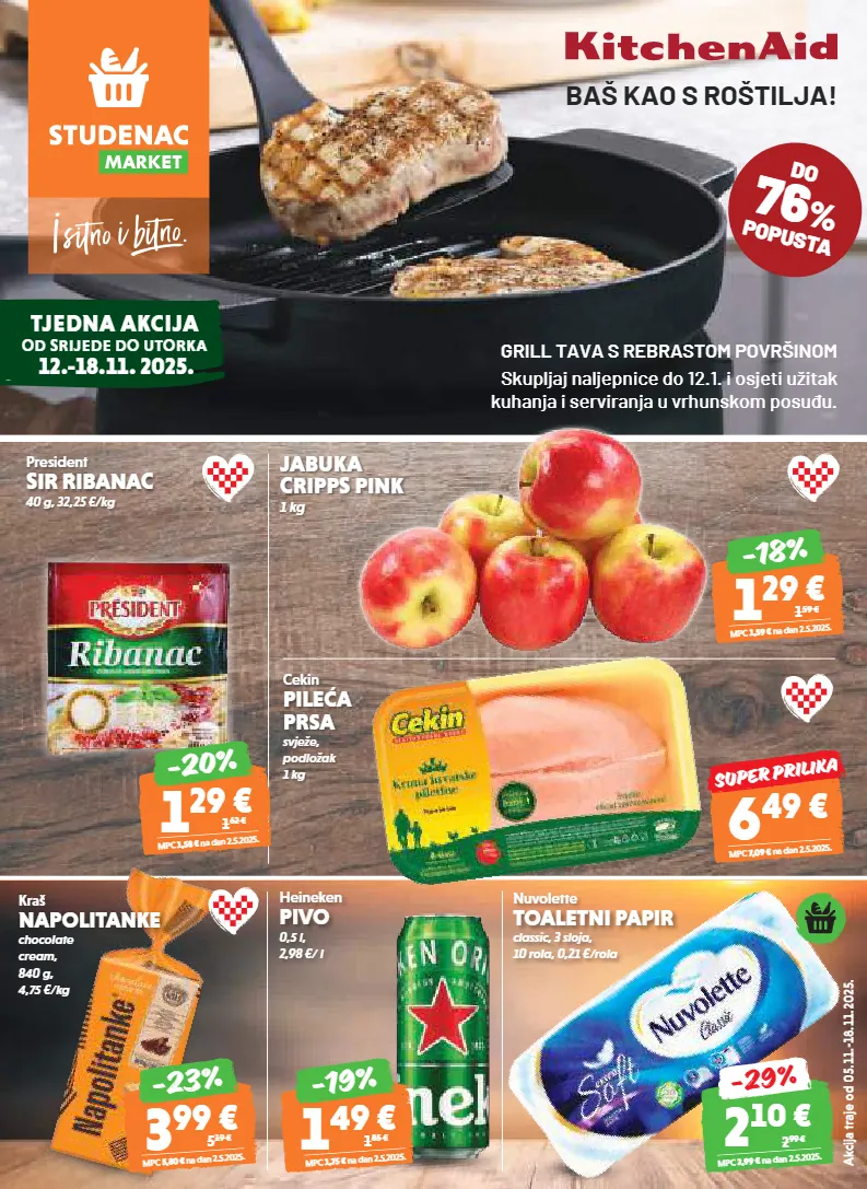 grill tava s rebrastom površinom skupljaj naljepnice do 12.1. i osjeti užitak kuhanja i serviranja u vrhunskom posuđu. do 76 % popusta baš kao s roštilja! 6 49 € mpc 7,09 € na dan 2.5.2025. super prilika cekin pileća prsa svježe, podložak 1 kg president sir ribanac 40 g, 32,25 €/kg -20% 1 29 € mpc 1,58 € na dan 2.5.2025. 1 62 € akcija traje od 05.11.-18.11.2025. od srijede do utorka tjedna akcija 12.-18.11. 2025. heineken pivo 0,5 l, 2,98 €/ l -23% 3 99 € mpc 5,80 € na dan 2.5.2025. 5 19 € kraš napolitanke chocolate cream, 840 g, 4,75 €/kg nuvolette toaletni papir classic, 3 sloja, 10 rola, 0,21 €/rola -29% 2 10 € mpc 2,99 € na dan 2.5.2025. 2 99 € -19% 1 49 € mpc 1,75 € na dan 2.5.2025. 1 85 € jabuka cripps pink 1 kg -18% 1 29 € mpc 1,59 € na dan 2.5.2025. 1 59 €
