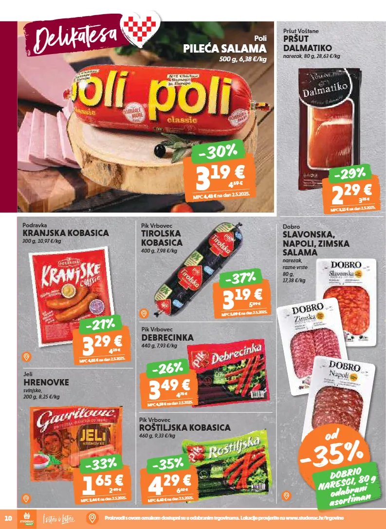 -21% 3 29 € mpc 4,01 € na dan 2.5.2025. 4 19 € podravka kranjska kobasica 300 g, 10,97 €/kg dobro slavonska, napoli, zimska salama narezak, razne vrste 80 g, 17,38 €/kg -33% 1 65 € mpc 2,44 € na dan 2.5.2025. 2 49 € jeli hrenovke svinjske, 200 g, 8,25 €/kg -30% 3 19 € mpc 4,43 € na dan 2.5.2025. 4 59 € poli pileća salama 500 g, 6,38 €/kg -37% 3 19 € mpc 5,09 € na dan 2.5.2025. 5 09 € pik vrbovec tirolska kobasica 400 g, 7,98 €/kg -26% 3 49 € mpc 4,58 € na dan 2.5.2025. 4 75 € pik vrbovec debrecinka 440 g, 7,93 €/kg -35% 4 29 € mpc 6,62 € na dan 2.5.2025. 6 62 € pik vrbovec roštiljska kobasica 460 g, 9,33 €/kg -35% dobrio naresci, 80 g odabrani asortiman od -29% 2 29 € mpc 3,11 € na dan 2.5.2025. 3 25 € pršut voštane pršut dalmatiko narezak, 80 g, 28,63 €/kg delikatesa 10 proizvodi s ovom oznakom dostupni su u odabranim trgovinama. lokacije provjerite na www.studenac.hr/trgovine
