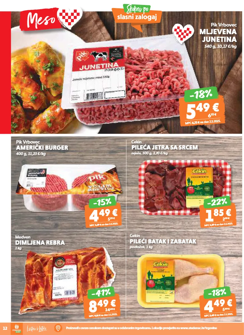 cekin pileća jetra sa srcem svježe, 500 g, 3,70 €/kg pik vrbovec američki burger 400 g, 11,23 €/kg pik vrbovec mljevena junetina 540 g, 10,17 €/kg cekin pileći batak i zabatak podložak, 1 kg medven dimljena rebra 1 kg -41% 8 49 € mpc 9,35 € na dan 2.5.2025. 14 49 € meso skokni po slasni zalogaj 12 proizvodi s ovom oznakom dostupni su u odabranim trgovinama. lokacije provjerite na www.studenac.hr/trgovine -22% 1 85 € mpc 2,39 € na dan 2.5.2025. 2 39 € -18% 4 49 € mpc 5,49 € na dan 2.5.2025. 5 49 € -15% 4 49 € mpc 5,29 € na dan 2.5.2025. 5 29 € -18% 5 49 € mpc 6,72 € na dan 2.5.2025. 6 72 €