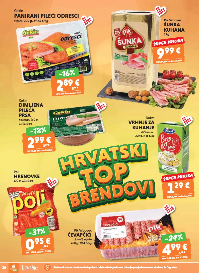 16 proizvodi s ovom oznakom dostupni su u odabranim trgovinama. lokacije provjerite na www.studenac.hr/trgovine -18% 2 99 € mpc 3,56 € na dan 2.5.2025. 3 69 € cekin dimljena pileća prsa narezak, 250 g, 11,96 €/kg -31% 0 95 € mpc 1,28 € na dan 2.5.2025. 1 39 € poli hrenovke 130 g, 7,31 €/kg 1 29 € mpc 1,59 € na dan 2.5.2025. super prilika dukat vrhnje za kuhanje 20% m.m., 200 g, 6,45 €/kg -24% 4 99 € mpc 6,62 € na dan 2.5.2025. 6 62 € pik vrbovec ćevapčići juneći, svježe 480 g, 10,4 €/kg -16% 2 89 € mpc 3,35 € na dan 2.5.2025. 3 45 € cekin panirani pileći odresci svježe, 200 g, 14,45 €/kg 16 proizvodi s ovom oznakom dostupni su u odabranim trgovinama. lokacije provjerite na www.studenac.hr/trgovine 9 99 € mpc 14,87 € na dan 2.5.2025. super prilika pik vrbovec šunka kuhana 1 kg