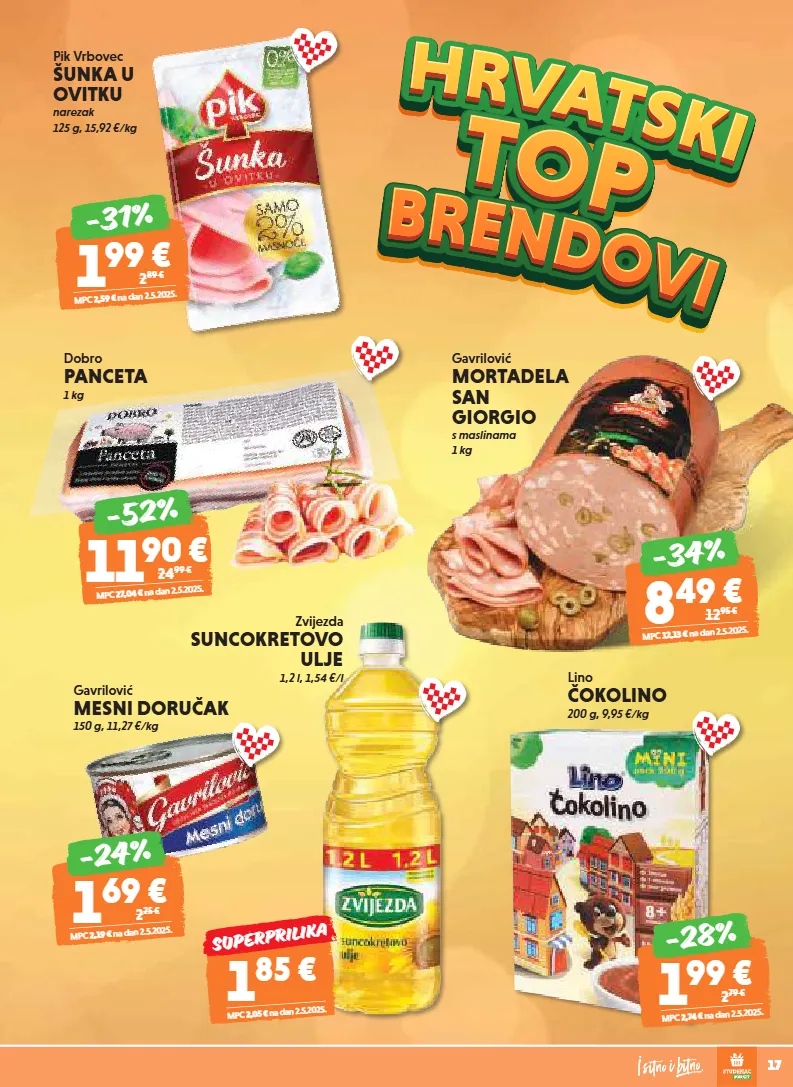 17 -34% 8 49 € mpc 12,13 € na dan 2.5.2025. 12 95 € gavrilović mortadela san giorgio s maslinama 1 kg -31% 1 99 € mpc 2,59 € na dan 2.5.2025. 2 89 € pik vrbovec šunka u ovitku narezak 125 g, 15,92 €/kg -52% 11 90 € mpc 27,04 € na dan 2.5.2025. 24 99 € dobro panceta 1 kg -24% 1 69 € mpc 2,19 € na dan 2.5.2025. 2 25 € gavrilović mesni doručak 150 g, 11,27 €/kg 17 1 85 € mpc 2,05 € na dan 2.5.2025. superprilika zvijezda suncokretovo ulje 1,2 l, 1,54 €/l -28% 1 99 € mpc 2,74 € na dan 2.5.2025. 2 79 € lino čokolino 200 g, 9,95 €/kg