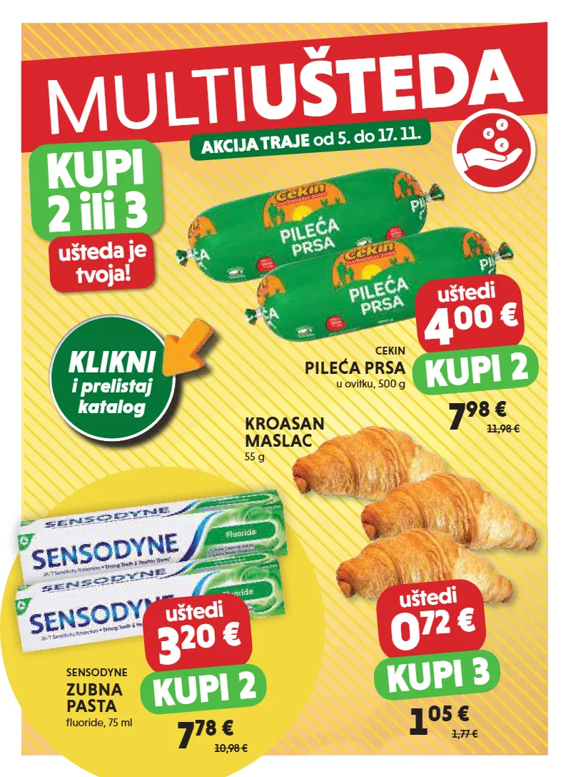 multi ušteda akcija traje od 5. do 17. 11. € € € klikni i prelistaj katalog kupi 2 ili 3 ušteda je tvoja! 11,98 € 7 98 € uštedi 4 00 € kupi 2 cekin pileća prsa u ovitku, 500 g 1,77 € 1 05 € uštedi 0 72 € kupi 3 kroasan maslac 55 g 10,98 € 7 78 € uštedi 3 20 € kupi 2 sensodyne zubna pasta fluoride, 75 ml