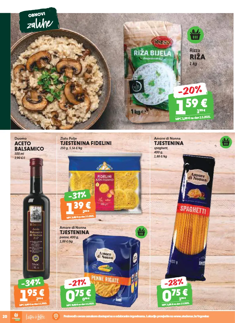 -20% 1 59 € mpc 1,99 € na dan 2.5.2025. 1 99 € rizza riža 1 kg -34% 1 95 € mpc 2,99 € na dan 2.5.2025. 2 99 € duomo aceto balsamico 500 ml 3,90 €/l -31% 1 39 € mpc 2,03 € na dan 2.5.2025. 2 03 € zlato polje tjestenina fidelini 250 g, 5,56 €/kg amore di nonna tjestenina spaghetti, 400 g, 1,88 €/kg amore di nonna tjestenina penne , 400 g, 1,88 €/kg -21% 0 75 € mpc 0,95 € na dan 2.5.2025. 0 95 € -28% 0 75 € mpc 1,01 € na dan 2.5.2025. 1 05 € zalihe obnovi 20 proizvodi s ovom oznakom dostupni su u odabranim trgovinama. lokacije provjerite na www.studenac.hr/trgovine