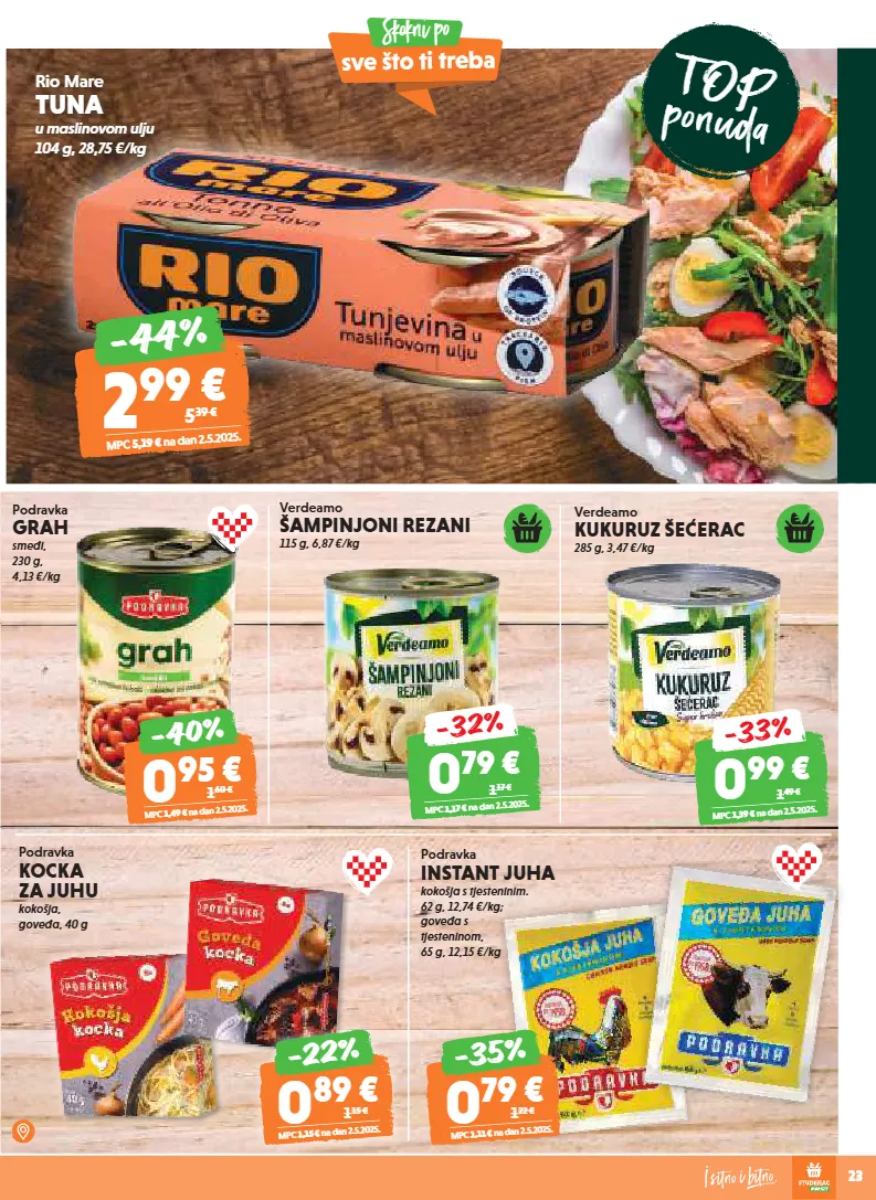 skokni po sve što ti treba -44% 2 99 € mpc 5,19 € na dan 2.5.2025. 5 39 € rio mare tuna u maslinovom ulju 104 g, 28,75 €/kg podravka instant juha kokošja s tjesteninim. 62 g, 12,74 €/kg; goveđa s tjesteninom, 65 g, 12,15 €/kg -35% 0 79 € mpc 1,11 € na dan 2.5.2025. 1 22 € podravka kocka za juhu kokošja, goveđa, 40 g -22% 0 89 € mpc 1,15 € na dan 2.5.2025. 1 15 € 23 top top ponuda verdeamo kukuruz šećerac 285 g, 3,47 €/kg -33% 0 99 € mpc 1,39 € na dan 2.5.2025. 1 49 € -32% 0 79 € mpc 1,17 € na dan 2.5.2025. 1 17 € verdeamo šampinjoni rezani 115 g, 6,87 €/kg -40% 0 95 € mpc 1,49 € na dan 2.5.2025. 1 60 € podravka grah smeđi, 230 g, 4,13 €/kg