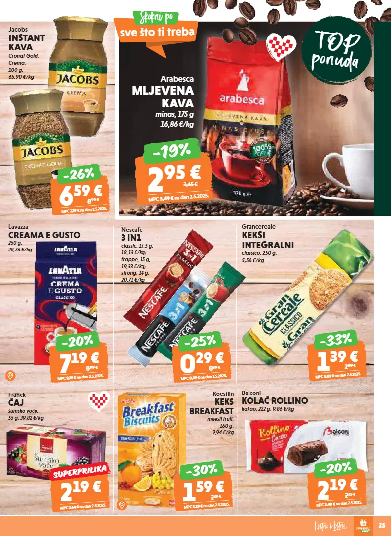 franck čaj šumsko voće, 55 g, 39,82 €/kg -19% 2 95 € mpc 3,49 € na dan 2.5.2025. 3,65 € arabesca mljevena kava minas, 175 g 16,86 €/kg nescafe 3 in1 classic, 15,5 g, 18,13 €/kg; frappe, 15 g, 19,33 €/kg; strong, 14 g, 20,71 €/kg -20% 7 19 € mpc 9,29 € na dan 2.5.2025. 8 99 € lavazza creama e gusto 250 g, 28,76 €/kg 2 19 € mpc 2,64 € na dan 2.5.2025. superprilika grancereale keksi integralni classico, 250 g, 5,56 €/kg -33% 1 39 € mpc 2,03 € na dan 2.5.2025. 2 09 € skokni po sve što ti treba jacobs instant kava cronat gold, crema, 100 g, 65,90 €/kg balconi kolač rollino kakao, 222 g, 9,86 €/kg -30% 1 59 € mpc 2,29 € na dan 2.5.2025. 2 29 € koestlin keks breakfast muesli fruit, 160 g, 9,94 €/kg 25 top top ponuda ponuda -26% 6 59 € mpc 7,29 € na dan 2.5.2025. 8 99 € -25% 0 29 € mpc 0,39 € na dan 2.5.2025. 0 39 € -20% 2 19 € mpc 2,49 € na dan 2.5.2025. 2 75 €
