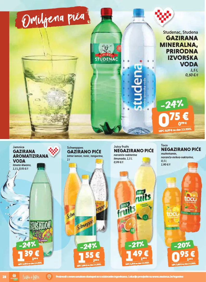 28 proizvodi s ovom oznakom dostupni su u odabranim trgovinama. lokacije provjerite na www.studenac.hr/trgovine studenac, studena gazirana mineralna, prirodna izvorska voda 1,5 l, 0,50 €/l -24% 0 75 € mpc 0,97 € na dan 2.5.2025. 0 99 € toco negazirano piće multivitamin, naranča-mrkva-nektarina, 0,5 l, 1,90 €/l -20% 0 95 € mpc 1,07 € na dan 2.5.2025. 1 19 € schweppes gazirano piće bitter lemon, tonic, tangerine, 1 l -24% 1 55 € mpc 1,96 € na dan 2.5.2025. 2 05 € jamnica gazirana aromatizirana voda limeta-kiwano, 1,5 l, 0,93 €/l -24% 1 39 € mpc 1,72 € na dan 2.5.2025. 1 85 € juicy fruits negazirano piće naranča-nektarina limunada, 1,5 l, 0,99 €/l -21% 1 49 € mpc 1,72 € na dan 2.5.2025. 1 89 € omiljena pića