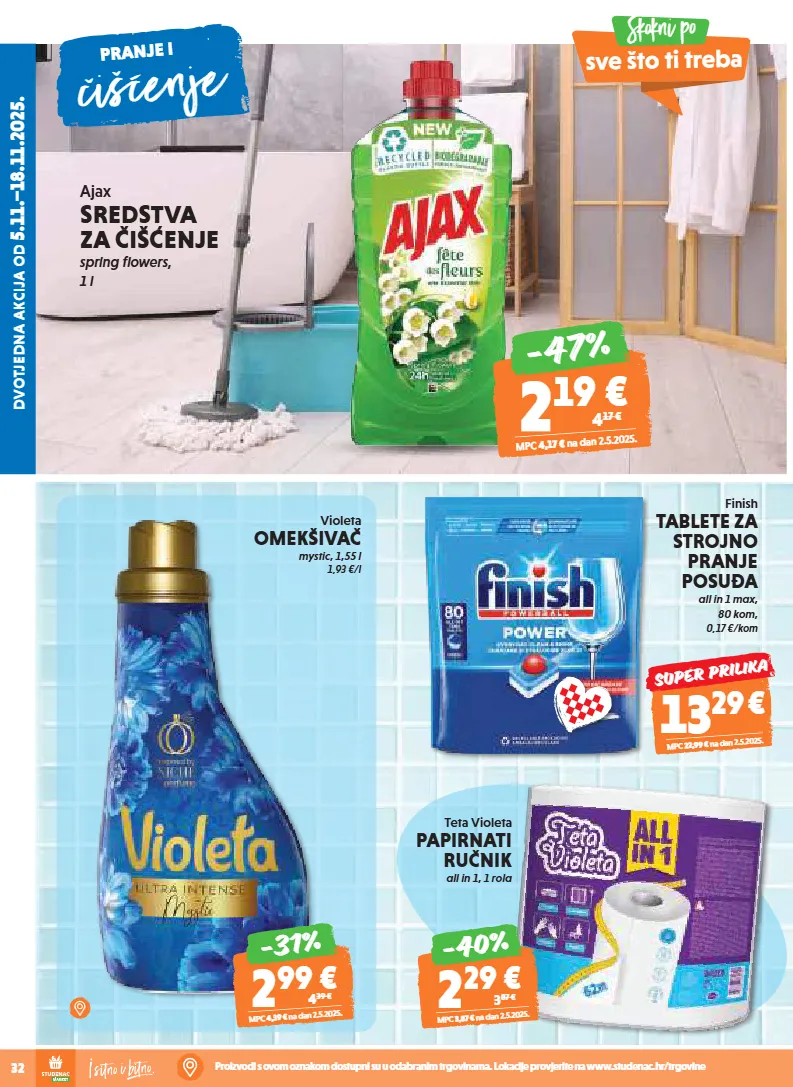 32 proizvodi s ovom oznakom dostupni su u odabranim trgovinama. lokacije provjerite na www.studenac.hr/trgovine čišćenje pranje i ajax sredstva za čišćenje spring flowers, 1 l -47% 2 19 € mpc 4,17 € na dan 2.5.2025. 4 17 € skokni po sve što ti treba 13 29 € mpc 22,99 € na dan 2.5.2025. super prilika dvotjedna akcija od 5.11.–18.11.2025. -31% 2 99 € mpc 4,39 € na dan 2.5.2025. 4 39 € finish tablete za strojno pranje posuđa all in 1 max, 80 kom, 0,17 €/kom violeta omekšivač mystic, 1,55 l 1,93 €/l -40% 2 29 € mpc 3,87 € na dan 2.5.2025. 3 87 € teta violeta papirnati ručnik all in 1, 1 rola