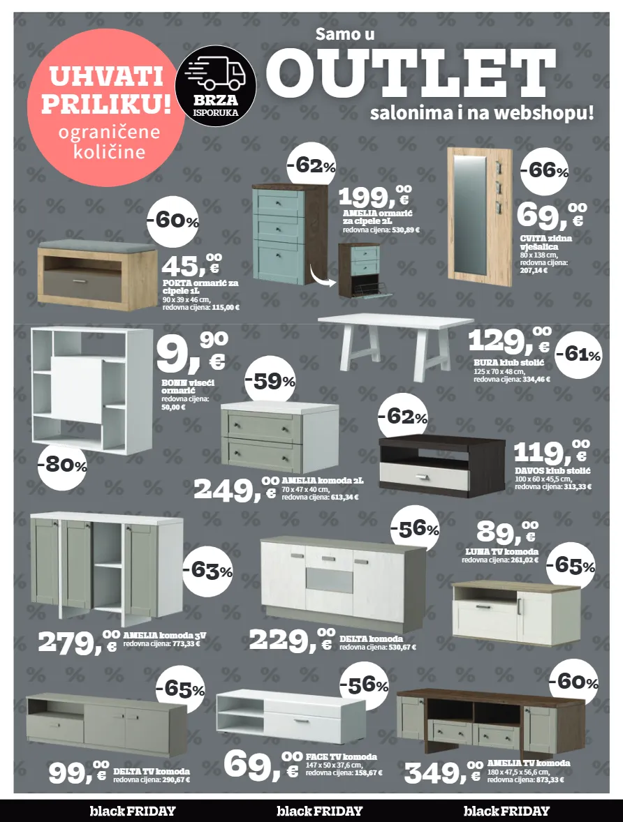 outlet salonima i na webshopu! samo u uhvati priliku! ograničene količine brza isporuka - 63 % - 59 % - 62 % davos klub stolić 100 x 60 x 45,5 cm, redovna cijena: 313,33 € 119 , 00 € - 80 % bonn viseći ormarić redovna cijena: 50,00 € 9, 90 € - 65 % - 56 % - 56 % - 62 % amelia ormarić za cipele 2l redovna cijena: 530,89 € 199 , 00 € face tv komoda 147 x 50 x 37,6 cm, redovna cijena: 158,67 € 69 , 00 € delta tv komoda redovna cijena: 290,67 € 99 , 00 € - 60 % amelia tv komoda 180 x 47,5 x 56,6 cm, redovna cijena: 873,33 € 349 , 00 € delta komoda redovna cijena: 530,67 € 229 , 00 € - 61 % bura klub stolić 125 x 70 x 48 cm, redovna cijena: 334,46 € 129, 00 € amelia komoda 2l 70 x 47 x 40 cm, redovna cijena: 613,34 € 249 , 00 € porta ormarić za cipele 1l 90 x 39 x 46 cm, redovna cijena: 115,00 € 45 , 00 € - 60 % cvita zidna vješalica 80 x 138 cm, redovna cijena: 207,14 € 69 , 00 € - 66 % - 65 % luna tv komoda redovna cijena: 261,02 € 89 , 00 € amelia komoda 3v redovna cijena: 773,33 € 279 , 00 €