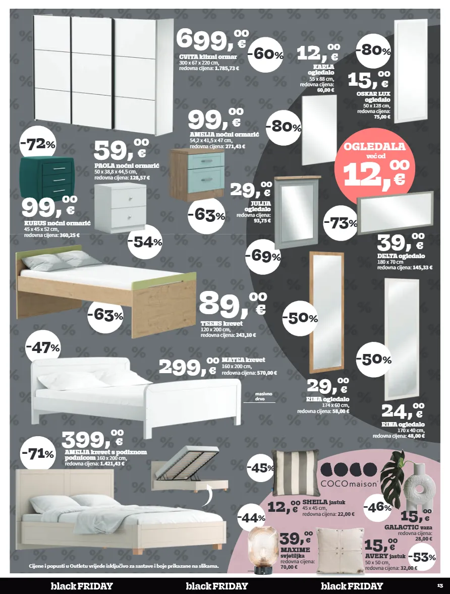 13 - 63 % cijene i popusti u outletu vrijede isključivo za sastave i boje prikazane na slikama. - 54 % paola noćni ormarić 50 x 38,8 x 44,5 cm, redovna cijena: 128,57 € 59 , 00 € - 63 % amelia noćni ormarić 54,2 x 41,5 x 47 cm, redovna cijena: 271,43 € 99 , 00 € - 72 % kubus noćni ormarić 45 x 45 x 52 cm, redovna cijena: 360,25 € 99 , 00 € - 80 % - 80 % oskar lux ogledalo 50 x 128 cm, redovna cijena: 75,00 € 15, 00 € ogledala 12, 00 već od € karla ogledalo 55 x 88 cm, redovna cijena: 60,00 € 12, 00 € - 73 % delta ogledalo 180 x 70 cm redovna cijena: 145,33 € 39, 00 € - 69 % - 50 % julija ogledalo redovna cijena: 93,75 € 29, 00 € rina ogledalo 170 x 40 cm, redovna cijena: 48,00 € 24, 00 € rina ogledalo 174 x 60 cm, redovna cijena: 58,00 € 29, 00 € - 50 % - 45 % - 46 % - 53 % - 44 % avery jastuk 50 x 50 cm, redovna cijena: 32,00 € 15, 00 € maxime svjetiljka redovna cijena: 70,00 € 39, 00 € galactic vaza redovna cijena: 28,00 € 15, 00 € sheila jastuk 45 x 45 cm, redovna cijena: 22,00 € 12, 00 € - 71 % amelia krevet s podiznom podnicom 160 x 200 cm, redovna cijena: 1.421,43 € 399, 00 € - 47 % matea krevet 160 x 200 cm, redovna cijena: 570,00 € 299, 00 € masivno drvo teens krevet 120 x 200 cm, redovna cijena: 243,10 € 89, 00 € - 60 % cvita klizni ormar 300 x 67 x 220 cm, redovna cijena: 1.785,73 € 699 , 00 €