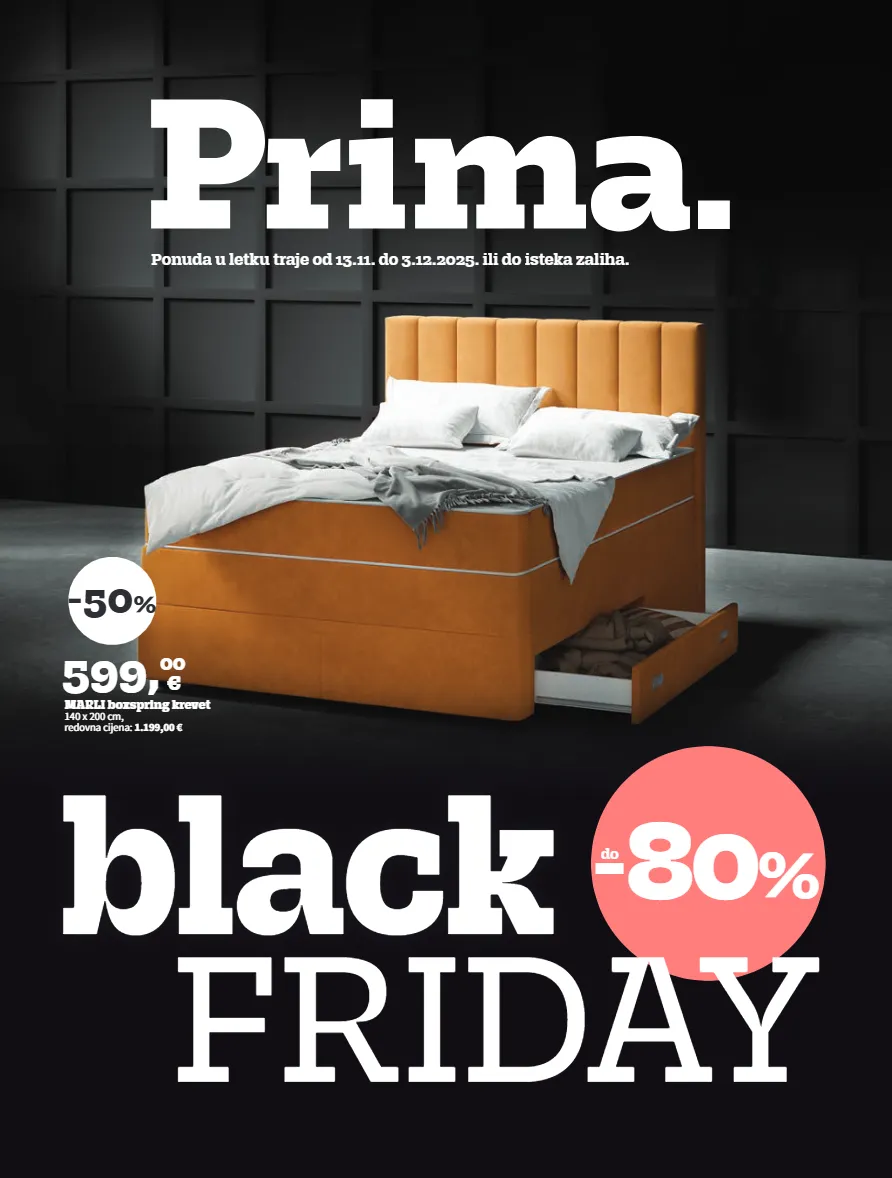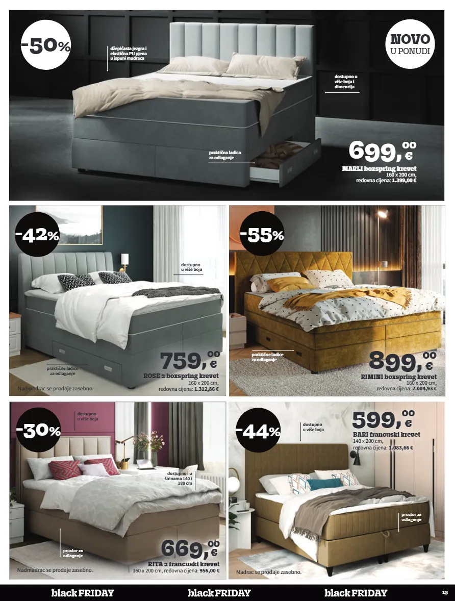 - 50 % marli boxspring krevet 140 x 200 cm, redovna cijena: 1.199,00 € 599, 00 € - 80 % do black friday ponuda u letku traje od 13.11. do 3.12.2025. ili do isteka zaliha.
