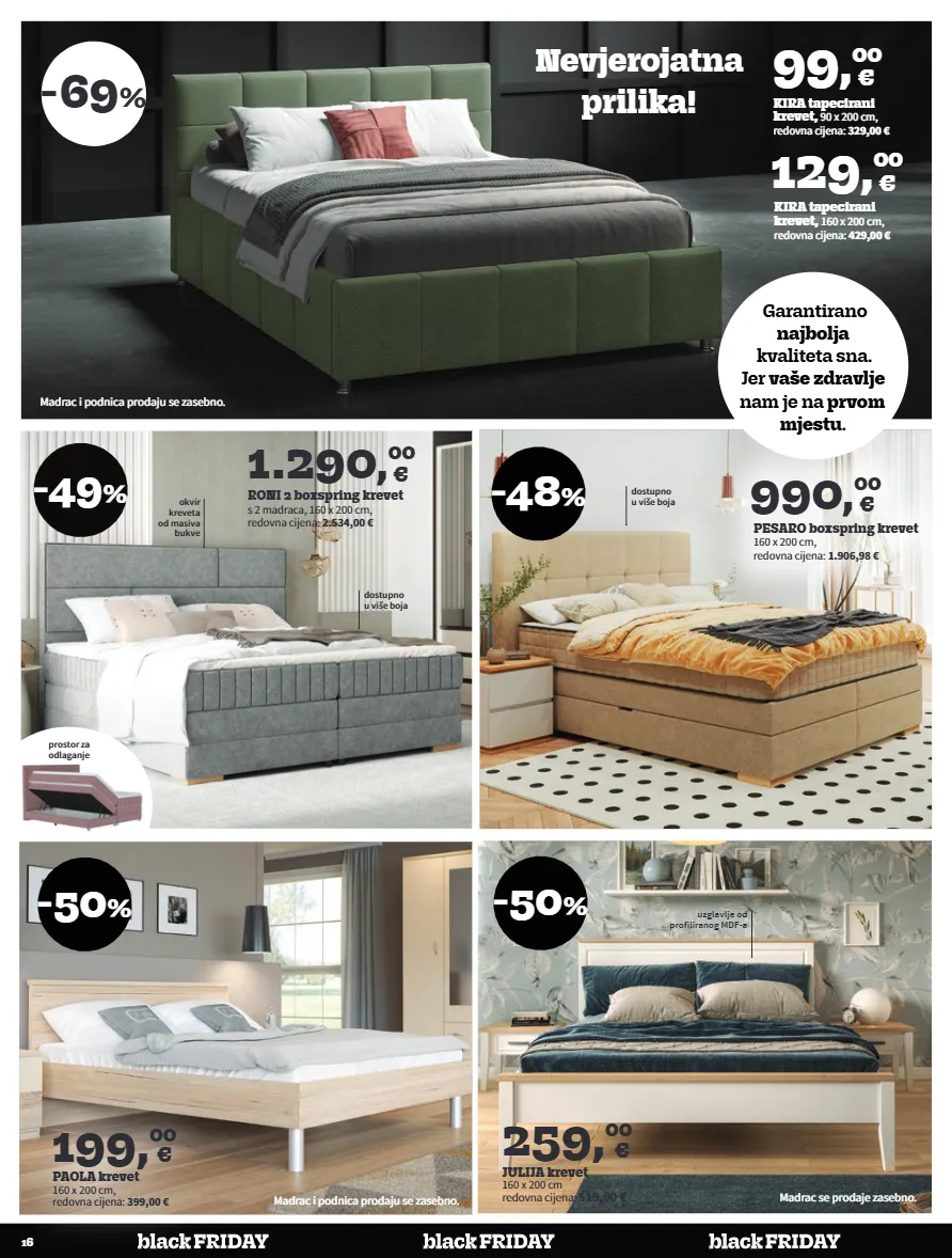 16 - 69 % pesaro boxspring krevet 160 x 200 cm, redovna cijena: 1.906,98 € 990 , 00 € dostupno u više boja - 48 % - 50 % madrac se prodaje zasebno. paola krevet 160 x 200 cm, redovna cijena: 399,00 € 199, 00 € - 50 % julija krevet 160 x 200 cm redovna cijena: 519,00 € 259, 00 € uzglavlje od profiliranog mdf-a roni 2 boxspring krevet s 2 madraca, 160 x 200 cm, redovna cijena: 2.534,00 € 1.290 , 00 € okvir kreveta od masiva bukve prostor za odlaganje dostupno u više boja - 49 % garantirano najbolja kvaliteta sna. jer vaše zdravlje nam je na prvom mjestu . kira tapecirani krevet, 160 x 200 cm, redovna cijena: 429,00 € 129 , 00 € kira tapecirani krevet, 90 x 200 cm, redovna cijena: 329,00 € 99 , 00 € madrac i podnica prodaju se zasebno. nevjerojatna prilika! madrac i podnica prodaju se zasebno.