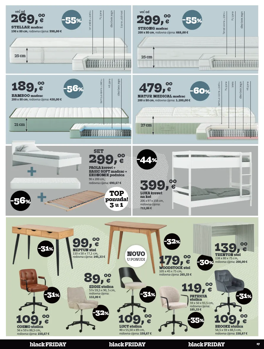 17 stellar madrac 190 x 80 cm , redovna cijena: 598,00 € 269, 00 € - 55 % džepićasta jezgra ioni srebra u pletivu 5 zona udobnosti pu pjena 25 cm strong madrac 200 x 80 cm , redovna cijena: 668,00 € već od 299, 00 € - 55 % 25 cm džepićasta jezgra pu pjena tencel vlakna u pletivu već od bamboo madrac 200 x 80 cm , redovna cijena: 430,00 € 189, 00 € džepićasta jezgra hr pjena bambus vlakna u pletivu - 56 % 21 cm natur medical madrac 200 x 80 cm , redovna cijena: 1.200,00 € 479, 00 € džepićasta jezgra pu pjena lateks bambus vlakna u pletivu hr pjena - 60 % 27 cm 99, 00 € neptun stol 110 x 50 x 77,1 cm, redovna cijena: 145,33 € - 31 % - 32 % - 30 % - 31 % - 31 % - 35 % - 32 % - 31 % 119, 00 € patricia stolica 59 x 50 x 93,5 cm, redovna cijena: 185,33 € trenton stol 138 x 80 x 75 cm, redovna cijena: 200,00 € 179, 00 € woodstock stol 105 x 45 x 75 cm, redovna cijena: 265,33 € 109, 00 € lucy stolica 48 x 55,50 x 89 cm, redovna cijena: 158,67 € 89, 00 € eddie stolica 57x 59,5 x 90, 5 cm, redovna cijena: 132,00 € 109, 00 € cosmo stolica 56 x 59 x 88,5 cm, redovna cijena: 158,67 € € 139, 00 paola krevet + basic soft madrac + ekonomik podnica 90 x 200 cm, redovna cijena: 690,67 € 299, 00 € set top ponuda! 3 u 1 + + - 56 % - 44 % 399, 00 € luka krevet na kat 206 x 97 x 158 cm, redovna cijena: 712,86 € novo u ponudi € 109, 00 brooke stolica 58,5 x 59 x 88,5 cm, redovna cijena: 158,67 €
