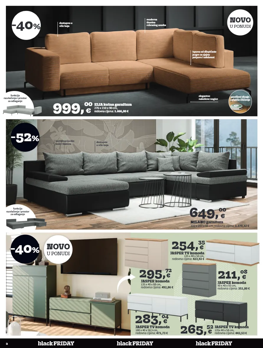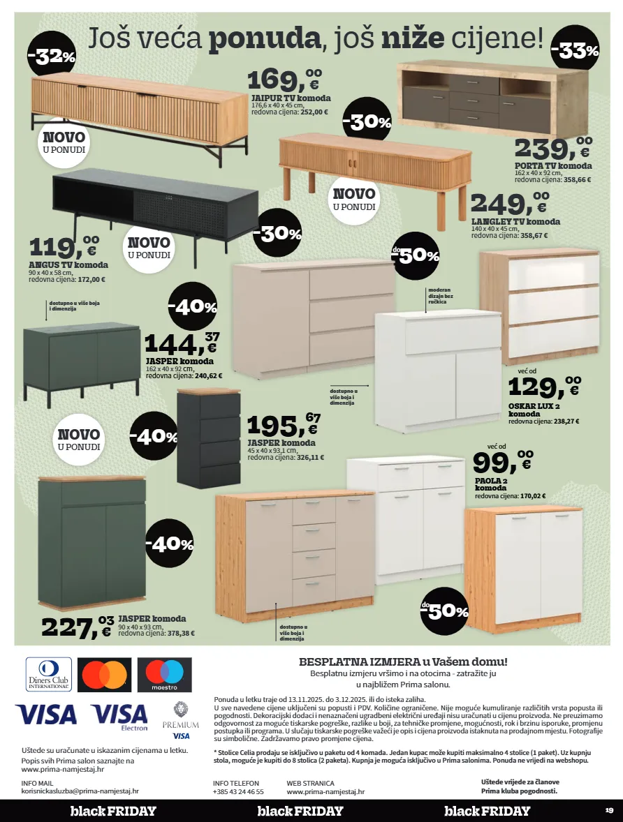 19 još veća ponuda , još niže cijene! dostupno u više boja i dimenzija - 50 % do - 50 % do paola 2 komoda redovna cijena: 170,02 € 99, 00 € već od ponuda u letku traje od 13.11.2025. do 3.12.2025. ili do isteka zaliha. u sve navedene cijene uključeni su popusti i pdv. količine ograničene. nije moguće kumuliranje različitih vrsta popusta ili pogodnosti. dekoracijski dodaci i nenaznačeni ugradbeni električni uređaji nisu uračunati u cijenu proizvoda. ne preuzimamo odgovornost za moguće tiskarske pogreške, razlike u boji, za tehničke promjene, mogućnosti, rok i brzinu isporuke, promjenu postupka ili programa. u slučaju tiskarske pogreške važeći je opis i cijena proizvoda istaknuta na prodajnom mjestu. fotografije su simbolične. zadržavamo pravo promjene cijena. besplatna izmjera u vašem domu! besplatnu izmjeru vršimo i na otocima - zatražite ju u najbližem prima salonu. info mail korisnickasluzba@prima-namjestaj.hr info telefon +385 43 24 46 55 web stranica www.prima-namjestaj.hr uštede su uračunate u iskazanim cijenama u letku. popis svih prima salon saznajte na www.prima-namjestaj.hr uštede vrijede za članove prima kluba pogodnosti. * stolice celia prodaju se isključivo u paketu od 4 komada. jedan kupac može kupiti maksimalno 4 stolice (1 paket). uz kupnju stola, moguće je kupiti do 8 stolica (2 paketa). kupnja je moguća isključivo u prima salonima. ponuda ne vrijedi na webshopu. - 32 % - 30 % - 33 % - 40 % - 40 % - 40 % - 30 % jaipur tv komoda 176,6 x 40 x 45 cm , redovna cijena: 252,00 € 169 , 00 € angus tv komoda 90 x 40 x 58 cm , redovna cijena: 172,00 € 119 , 00 € novo u ponudi novo u ponudi novo u ponudi novo u ponudi dostupno u više boja i dimenzija oskar lux 2 komoda redovna cijena: 238,27 € 129, 00 € već od moderan dizajn bez ručkica dostupno u više boja i dimenzija jasper komoda 90 x 40 x 93 cm, redovna cijena: 378,38 € 227 , 03 € jasper komoda 45 x 40 x 93,1 cm, redovna cijena: 326,11 € 195 , 67 € jasper komoda 162 x 40 x 92 cm, redovna cijena: 240,62 € 144 , 37 € langley tv komoda 140 x 40 x 45 cm , redovna cijena: 358,67 € 249 , 00 € porta tv komoda 162 x 40 x 92 cm , redovna cijena: 358,66 € 239 , 00 €