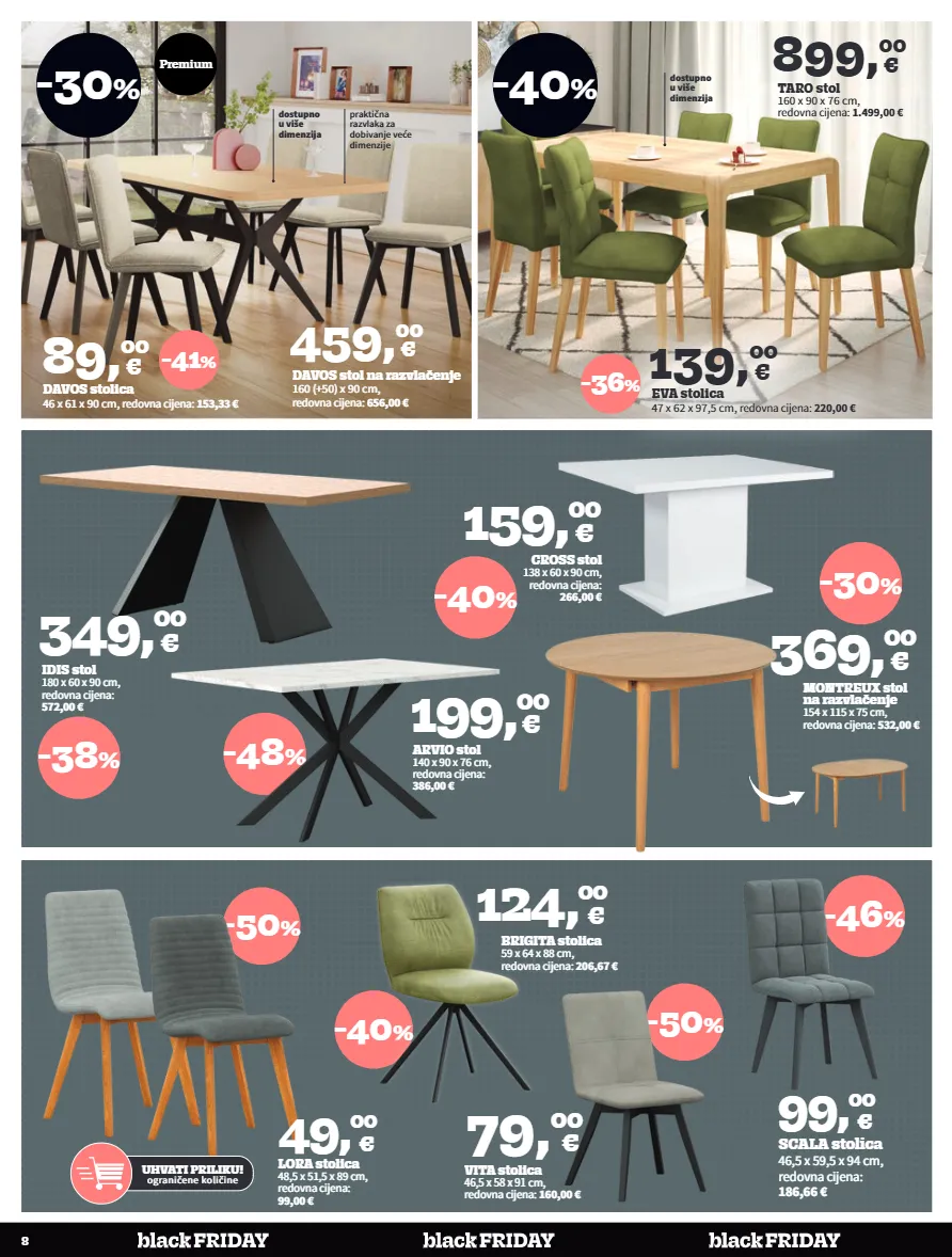8 premium dostupno u više dimenzija dostupno u više dimenzija praktična razvlaka za dobivanje veće dimenzije davos stolica 46 x 61 x 90 cm, redovna cijena: 153,33 € 89, 00 € davos stol na razvlačenje 160 (+50) x 90 cm, redovna cijena: 656,00 € 459, 00 € taro stol 160 x 90 x 76 cm, redovna cijena: 1.499,00 € 899, 00 € - 30 % - 40 % idis stol 180 x 60 x 90 cm , redovna cijena: 572,00 € 349, 00 € cross stol 138 x 60 x 90 cm , redovna cijena: 266,00 € 159, 00 € - 38 % - 30 % - 40 % - 48 % - 40 % brigita stolica 59 x 64 x 88 cm, redovna cijena: 206,67 € 124, 00 € - 50 % - 50 % eva stolica 47 x 62 x 97,5 cm, redovna cijena: 220,00 € 139, 00 € - 41 % - 36 % montreux stol na razvlačenje 154 x 115 x 75 cm , redovna cijena: 532,00 € 369, 00 € uhvati priliku! ograničene količine vita stolica 46,5 x 58 x 91 cm, redovna cijena: 160,00 € 79, 00 € - 46 % scala stolica 46,5 x 59,5 x 94 cm, redovna cijena: 186,66 € 99, 00 € lora stolica 48,5 x 51,5 x 89 cm, redovna cijena: 99,00 € 49, 00 € arvio stol 140 x 90 x 76 cm , redovna cijena: 386,00 € 199, 00 €