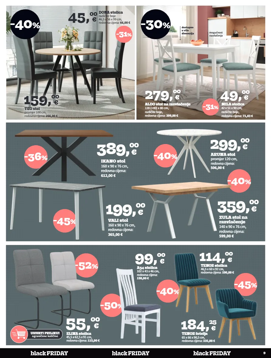 9 teo stol promjer 100 cm, redovna cijena: 266,00 € 159, 00 € dona stolica različite boje 46,5 x 56 x 99 cm, redovna cijena: 66,00 € 45, 00 € - 40 % dostupno u više dimenzija mogućnost razvlačenja aldo stol na razvlačenje 120 (+40) x 80 cm, različite boje, redovna cijena: 399,00 € 279, 00 € mila stolica 42 x 51 x 90 cm, različite boje, redovna cijena: 71,43 € 49, 00 € - 30 % - 40 % - 40 % - 45 % - 36 % ikano stol 160 x 90 x 76 cm , redovna cijena: 612,00 € 389, 00 € aruna stol promjer 120 cm , redovna cijena: 506,00 € 299, 00 € - 40 % - 45 % - 50 % tenor stolica 46,5 x 60 x 92 cm, redovna cijena: 190,00 € 114, 00 € tenor fotelja 65 x 66 x 90,5 cm, redovna cijena: 335,00 € 184, 25 € a34 stolica 102 x 43 x 46 cm, redovna cijena: 198,00 € 99, 00 € - 52 % elina stolica 45,5 x 62,5 x 91 cm, redovna cijena: 115,00 € 55, 00 € zula stol na razvlačenje 140 x 90 x 76 cm , redovna cijena: 599,00 € 359, 00 € vali stol 160 x 90 x 76 cm , redovna cijena: 365,00 € 199, 00 € - 31 % - 31 % uhvati priliku! ograničene količine