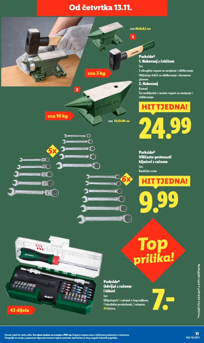 Top prilika ! 43 dijela Parkside® 1. Nakovanj s čekićem Set S okruglim rogom za savijanje i oblikovanje Uključuje čekić za oblikovanje s kovanom glavom 2. Nakovanj Komad Sa zaobljenim i ravnim rogom za savijanje i oblikovanje 24.99 HIT TJEDNA! cca 18x8x8,5 cm Parkside® Viličasto-prstenasti ključevi s račnom Set Različite vrste 9.99 HIT TJEDNA! 1 2 Od četvrtka 13.11. *modeli nisu dostupni u svim veličinama Parkside® Odvijač s račnom i bitovi Set Uključujući: 1 odvijač s čegrtaljkom, 1 feksibilni produžetak, 1 adapter, 40 bitova 7.- 5x cca 3 kg cca 10 kg 6x cca 31x12x10 cm 11 NAC 46/2025 Ponuda vrijedi do isteka zaliha. Sve cijene izražene su u eurima s PDV-om. Kupnja je moguća samo u količinama primjerenim za kućanstvo. Fotografije ne moraju u potpunosti odgovarati stvarnom izgledu proizvoda. Ispričavamo se zbog mogućih tiskarskih pogrešaka.