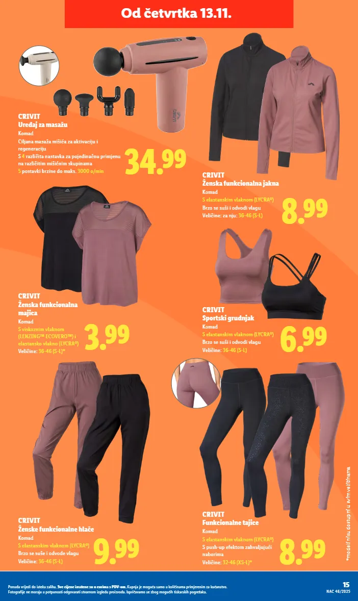 od četvrtka 13.11. crivit ženska funkcionalna majica komad s viskoznim vlaknom ( lenzing™ ecovero™ ) i elastansko vlakno (lycra®) veličine: 36-46 (s-l)* 3.99 crivit ženska funkcionalna jakna komad s elastanskim vlaknom (lycra®) brzo se suši i odvodi vlagu veličine: za nju: 36-46 (s-l) 8.99 crivit ženske funkcionalne hlače komad s elastanskim vlaknom (lycra®) brzo se suše i odvode vlagu veličine: 36-46 (s-l) 9.99 crivit uređaj za masažu komad ciljana masaža mišića za aktivaciju i regeneraciju s 4 različita nastavka za pojedinačnu primjenu na različitim mišićnim skupinama 5 postavki brzine do maks. 3000 o/min 34.99 crivit funkcionalne tajice komad s elastanskim vlaknom (lycra®) s push-up efektom zahvaljujući naborima veličine: 32-46 (xs-l)* 8.99 crivit sportski grudnjak komad s elastanskim vlaknom (lycra®) brzo se suši i odvodi vlagu veličine: 36-46 (s-l) 6.99 *modeli nisu dostupni u svim veličinama 15 nac 46/2025 ponuda vrijedi do isteka zaliha. sve cijene izražene su u eurima s pdv-om. kupnja je moguća samo u količinama primjerenim za kućanstvo. fotografije ne moraju u potpunosti odgovarati stvarnom izgledu proizvoda. ispričavamo se zbog mogućih tiskarskih pogrešaka.