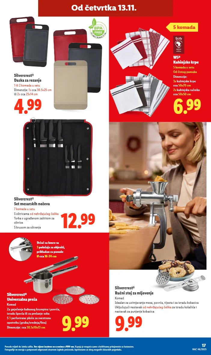 5 komada 17 nac 46/2025 ponuda vrijedi do isteka zaliha. sve cijene izražene su u eurima s pdv-om. kupnja je moguća samo u količinama primjerenim za kućanstvo. fotografije ne moraju u potpunosti odgovarati stvarnom izgledu proizvoda. ispričavamo se zbog mogućih tiskarskih pogrešaka. od četvrtka 13.11. 12.99 silvercrest® set mesarskih noževa 7 komada u setu s oštricama od nehrđajućeg čelika torba s ugrađenom zaštitom za oštrice s brusom za oštrenje 4.99 silvercrest® daska za rezanje 1 ili 2 komada u setu dimenzije: 1x cca 36.5x25 cm ili 2x cca 25x14 cm 9.99 silvercrest® ručni stoj za mljevenje komad idealan za usitnjavanje mesa, povrća, tijesta i za izradu kobasica uključujući nastavak od nehrđajućeg čelika za izradu kolačića i nastavak za punjenje kobasica 9.99 silvercrest® univerzalna preša komad za gnječenje kuhanog krumpira i povrća, izradu špecla ili za prešanje soka s 3 perforirane ploče za svestranu upotrebu (gruba/srednja/fina) dimenzije: cca 30.5x10x13 cm držač za lonce sa 3 položaja za objesiti, prikladan za posude ø cca 16-24 cm 6.99 w5® kuhinjske krpe 5 komada u setu od čistog pamuka dimenzije: 3x kuhinjske krpe cca 50x70 cm 2x kuhinjska ručnika cca 50x50 cm