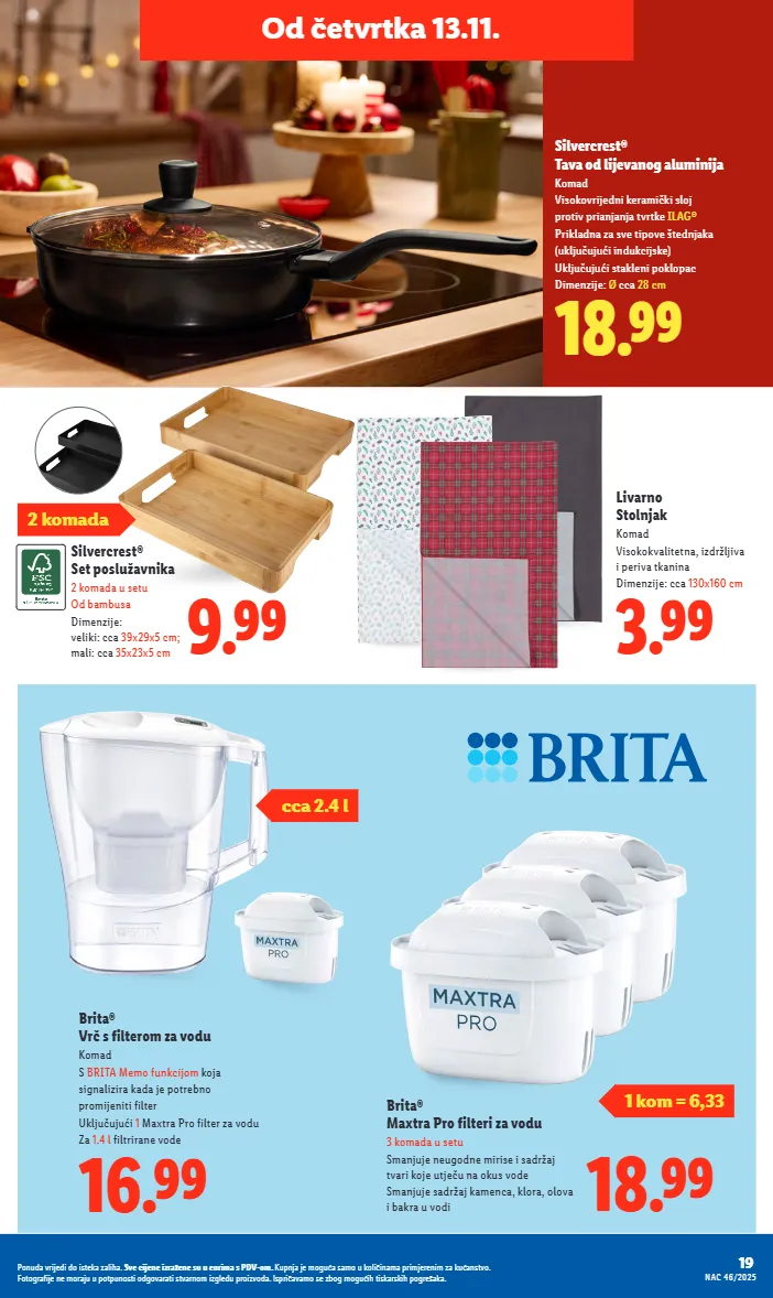 16.99 brita® vrč s filterom za vodu komad s brita memo funkcijom koja signalizira kada je potrebno promijeniti filter uključujući 1 maxtra pro filter za vodu za 1.4 l filtrirane vode 18.99 brita® maxtra pro filteri za vodu 3 komada u setu smanjuje neugodne mirise i sadržaj tvari koje utječu na okus vode smanjuje sadržaj kamenca, klora, olova i bakra u vodi 1 kom = 6,33 19 nac 46/2025 ponuda vrijedi do isteka zaliha. sve cijene izražene su u eurima s pdv-om. kupnja je moguća samo u količinama primjerenim za kućanstvo. fotografije ne moraju u potpunosti odgovarati stvarnom izgledu proizvoda. ispričavamo se zbog mogućih tiskarskih pogrešaka. od četvrtka 13.11. 18.99 silvercrest® tava od lijevanog aluminija komad visokovrijedni keramički sloj protiv prianjanja tvrtke ilag® prikladna za sve tipove štednjaka (uključujući indukcijske) uključujući stakleni poklopac dimenzije: ø cca 28 cm 9.99 silvercrest® set poslužavnika 2 komada u setu od bambusa dimenzije: veliki: cca 39x29x5 cm; mali: cca 35x23x5 cm 3.99 livarno stolnjak komad visokokvalitetna, izdržljiva i periva tkanina dimenzije: cca 130x160 cm cca 2.4 l 2 komada