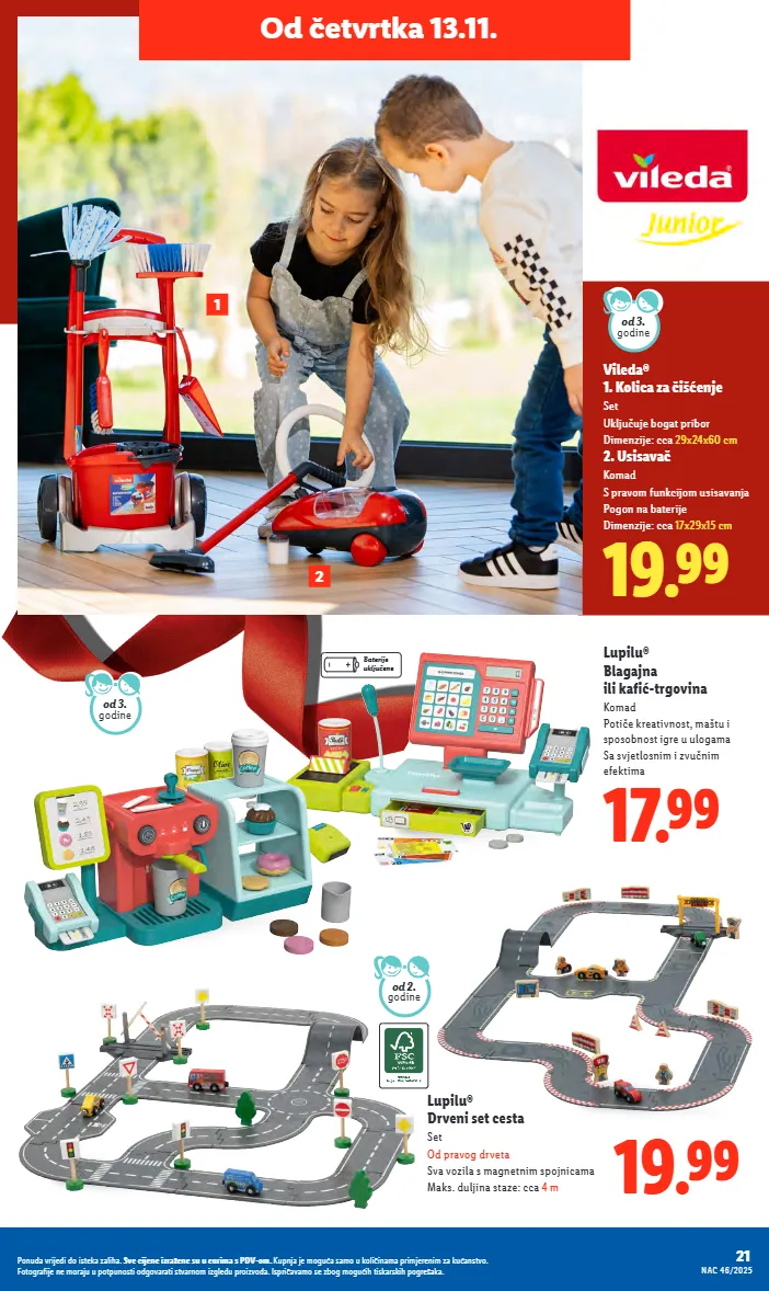 od 2. godine 2 1 od 3. godine baterije uključene od 3. godine 21 nac 46/2025 ponuda vrijedi do isteka zaliha. sve cijene izražene su u eurima s pdv-om. kupnja je moguća samo u količinama primjerenim za kućanstvo. fotografije ne moraju u potpunosti odgovarati stvarnom izgledu proizvoda. ispričavamo se zbog mogućih tiskarskih pogrešaka. 19.99 lupilu® drveni set cesta set od pravog drveta sva vozila s magnetnim spojnicama maks. duljina staze: cca 4 m 17.99 lupilu® blagajna ili kafić-trgovina komad potiče kreativnost, maštu i sposobnost igre u ulogama sa svjetlosnim i zvučnim efektima 19.99 vileda® 1. kolica za čišćenje set uključuje bogat pribor dimenzije: cca 29x24x60 cm 2. usisavač komad s pravom funkcijom usisavanja pogon na baterije dimenzije: cca 17x29x15 cm od četvrtka 13.11.
