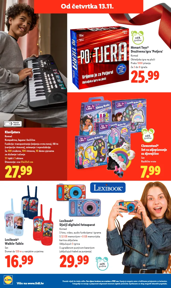 od 8. godine bebe, djeca i igračke ponuda vrijedi do isteka zaliha. sve cijene izražene su u eurima s pdv-om. kupnja je moguća samo u količinama primjerenim za kućanstvo. fotografije ne moraju u potpunosti odgovarati stvarnom izgledu proizvoda. ispričavamo se zbog mogućih tiskarskih pogrešaka. više na www.lidl.hr 27.99 klavijatura komad kompaktna, lagana i bežična funkcije: transponiranje (mijenja vrstu tona), fill-in (varijacije ritmova), snimanje i reprodukcija sa 100 zvukova, 100 ritmova, 10 demo pjesama za slušanje i učenje 37 tipki i 3 oktave dimenzije: cca 53x22x5 cm baterije uključene 25.99 menart toys® društvena igra 'potjera' komad obiteljska igra na ploči preko 1000 pitanja za 3 do 6 igrača 29.99 lexibook® dječji digitalni fotoaparat komad s foto, video, audio funkcijama i igrama s 32 gb memorijom + 8 gb memorijska kartica uključena uključujući 5 igrica s ugrađenom punjivom baterijom (uključujući kabel za punjenje) od 4. godine 16.99 lexibook® walkie-talkie set domet do 120 m u vanjskim uvjetima od četvrtka 13.11. 7.99 clementoni® set za uljepšavanje za djevojčice set različite vrste od 6. godine