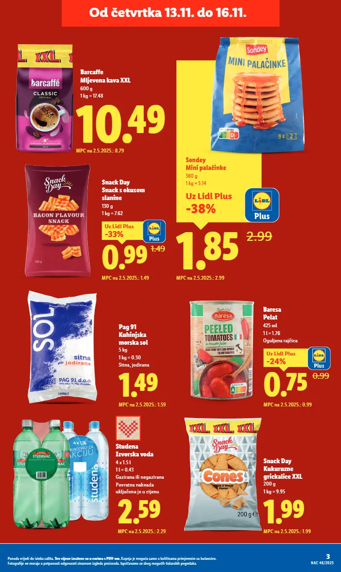 studena izvorska voda 4 x 1.5 l 1 l = 0.43 gazirana ili negazirana povratna naknada uključena je u cijenu barcaffe mljevena kava xxl 600 g 1 kg = 17.48 pag 91 kuhinjska morska sol 5 kg 1 kg = 0.30 sitna, jodirana 2.59 mpc na 2.5.2025.: 2.29 1.49 mpc na 2.5.2025.: 1.59 snack day kukuruzne grickalice xxl 200 g 1 kg = 9.95 1.99 mpc na 2.5.2025.: 1.99 0.99 0.75 -24% uz lidl plus mpc na 2.5.2025.: 0.99 1.49 0.99 -33% uz lidl plus mpc na 2.5.2025.: 1.49 uz lidl plus -38% 1.85 2.99 sondey mini palačinke 360 g 1 kg = 5.14 mpc na 2.5.2025.: 2.99 snack day snack s okusom slanine 130 g 1 kg = 7.62 baresa pelat 425 ml 1 l = 1.76 oguljena rajčica 10.49 mpc na 2.5.2025.: 8.79 3 nac 46/2025 ponuda vrijedi do isteka zaliha. sve cijene izražene su u eurima s pdv-om. kupnja je moguća samo u količinama primjerenim za kućanstvo. fotografije ne moraju u potpunosti odgovarati stvarnom izgledu proizvoda. ispričavamo se zbog mogućih tiskarskih pogrešaka. od četvrtka 13.11. do 16.11.