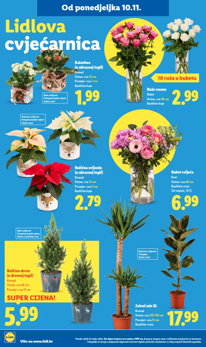2.99 Ruže rezane Buket Visina: cca 40 cm Različite boje Od ponedjeljka 10.11. 10 ruža u buketu 6.99 Buket cvijeća Kom Visina: cca 40 cm Različite vrste Od srijede, 12.11. Redovito zalijevati Polusjena/svijetlo mjesto Držati u kući Malo zalijevati Polusjena/svijetlo mjesto Držati u kući/držati vani Redovito zalijevati Polusjena Držati u kući 2.79 Božićna zvijezda (u ukrasnoj tegli) Komad Visina: cca 15 cm Promjer: cca 6 cm Različite boje 1.99 Kalanhoa (u ukrasnoj tegli) Komad Visina: cca 15 cm Promjer: cca 7 cm Različite boje Lidlova cvjećarnica Malo zalijevati Polusjena/svijetlo mjesto Držati u kući Ponuda vrijedi do isteka zaliha. Sve cijene izražene su u eurima s PDV-om. Kupnja je moguća samo u količinama primjerenim za kućanstvo. Fotografije ne moraju u potpunosti odgovarati stvarnom izgledu proizvoda. Ispričavamo se zbog mogućih tiskarskih pogrešaka. Više na www.lidl.hr 17.99 Zeleni mix XL Komad Visina: cca 110-130 cm Promjer: cca 21 cm Različite vrste 5.99 SUPER CIJENA! Božićno drvce (u drvenoj tegli) Komad Visina: cca 46 cm Promjer: cca 13 cm