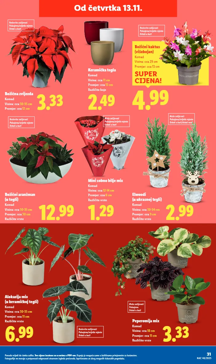 od četvrtka 13.11. ponuda vrijedi do isteka zaliha. sve cijene izražene su u eurima s pdv-om. kupnja je moguća samo u količinama primjerenim za kućanstvo. fotografije ne moraju u potpunosti odgovarati stvarnom izgledu proizvoda. ispričavamo se zbog mogućih tiskarskih pogrešaka. redovito zalijevati polusjena/svijetlo mjesto držati u kući 12.99 božićni aranžman (u tegli) komad visina: cca 30-35 cm promjer: cca 30 cm različite vrste 2.49 keramička tegla komad visina: cca 11 cm promjer: cca 13 cm različite boje 31 nac 46/2025 ponuda vrijedi do isteka zaliha. sve cijene izražene su u eurima s pdv-om. kupnja je moguća samo u količinama primjerenim za kućanstvo. fotografije ne moraju u potpunosti odgovarati stvarnom izgledu proizvoda. ispričavamo se zbog mogućih tiskarskih pogrešaka. 3.33 božićna zvijezda komad visina: cca 30-35 cm promjer: cca 12 cm 1.29 mini sobno bilje mix komad visina: cca 12-14 cm promjer: cca 6 cm različite vrste 3.33 peperomija mix komad visina: cca 18 cm promjer: cca 11 cm različite vrste 4.99 super cijena! božićni kaktus (višebojan) komad visina: cca 29 cm promjer: cca 13 cm redovito zalijevati polusjena/svijetlo mjesto držati u kući redovito zalijevati polusjena/svijetlo mjesto držati u kući malo zalijevati polusjena/svijetlo mjesto držati u kući malo zalijevati polusjena/svijetlo mjesto držati u kući/držati vani 2.99 elwoodi (u ukrasnoj tegli) komad visina: cca 30-34 cm promjer: cca 9 cm različite vrste 6.99 alokazija mix (u keramičkoj tegli) komad visina: cca 30-35 cm promjer: cca 11 cm različite vrste redovito zalijevati polusjena/svijetlo mjesto držati u kući malo zalijevati polusjena držati u kući
