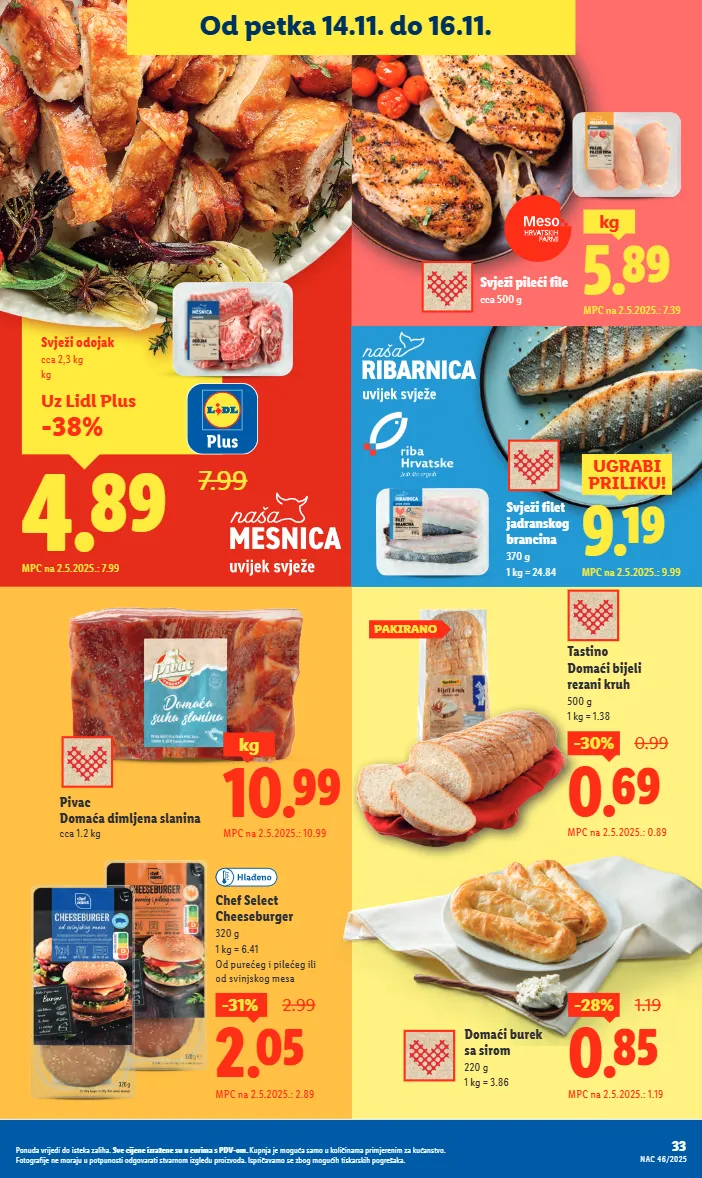 10.99 kg mpc na 2.5.2025.: 10.99 pivac domaća dimljena slanina cca 1.2 kg 2.05 -31% 2.99 mpc na 2.5.2025.: 2.89 chef select cheeseburger 320 g 1 kg = 6.41 od purećeg i pilećeg ili od svinjskog mesa 0.69 -30% 0.99 mpc na 2.5.2025.: 0.89 tastino domaći bijeli rezani kruh 500 g 1 kg = 1.38 svježi filet jadranskog brancina 370 g 1 kg = 24.84 9.19 ugrabi priliku! mpc na 2.5.2025.: 9.99 uz lidl plus -38% 4.89 7.99 svježi odojak cca 2,3 kg kg mpc na 2.5.2025.: 7.99 svježi pileći file cca 500 g 5.89 kg mpc na 2.5.2025.: 7.39 0.85 -28% 1.19 mpc na 2.5.2025.: 1.19 domaći burek sa sirom 220 g 1 kg = 3.86 pakirano 33 nac 46/2025 ponuda vrijedi do isteka zaliha. sve cijene izražene su u eurima s pdv-om. kupnja je moguća samo u količinama primjerenim za kućanstvo. fotografije ne moraju u potpunosti odgovarati stvarnom izgledu proizvoda. ispričavamo se zbog mogućih tiskarskih pogrešaka. od petka 14.11. do 16.11.