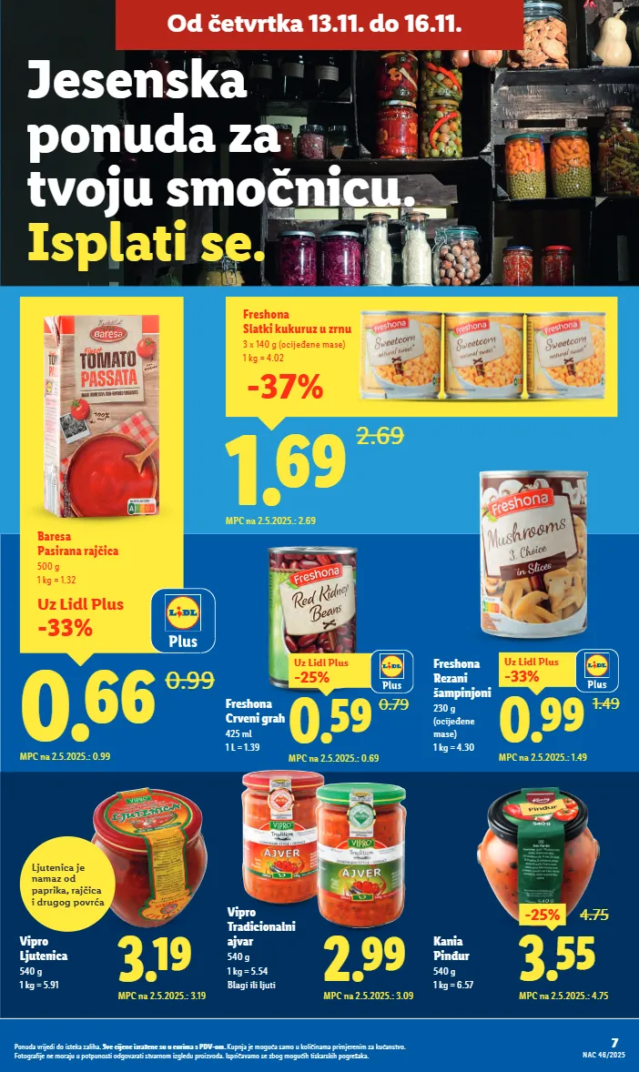 2.99 mpc na 2.5.2025.: 3.09 vipro tradicionalni ajvar 540 g 1 kg = 5.54 blagi ili ljuti ljutenica je namaz od paprika, rajčica i drugog povrća uz lidl plus -33% 0.66 0.99 baresa pasirana rajčica 500 g 1 kg = 1.32 mpc na 2.5.2025.: 0.99 kania pinđur 540 g 1 kg = 6.57 1.49 0.99 -33% uz lidl plus mpc na 2.5.2025.: 1.49 freshona rezani šampinjoni 230 g (ocijeđene mase) 1 kg = 4.30 1.69 2.69 freshona slatki kukuruz u zrnu 3 x 140 g (ocijeđene mase) 1 kg = 4.02 mpc na 2.5.2025.: 2.69 -37% 3.19 mpc na 2.5.2025.: 3.19 vipro ljutenica 540 g 1 kg = 5.91 3.55 -25% 4.75 mpc na 2.5.2025.: 4.75 freshona crveni grah 425 ml 1 l = 1.39 jesenska ponuda za tvoju smočnicu. isplati se. 0.79 0.59 -25% uz lidl plus mpc na 2.5.2025.: 0.69 7 nac 46/2025 ponuda vrijedi do isteka zaliha. sve cijene izražene su u eurima s pdv-om. kupnja je moguća samo u količinama primjerenim za kućanstvo. fotografije ne moraju u potpunosti odgovarati stvarnom izgledu proizvoda. ispričavamo se zbog mogućih tiskarskih pogrešaka. od četvrtka 13.11. do 16.11.
