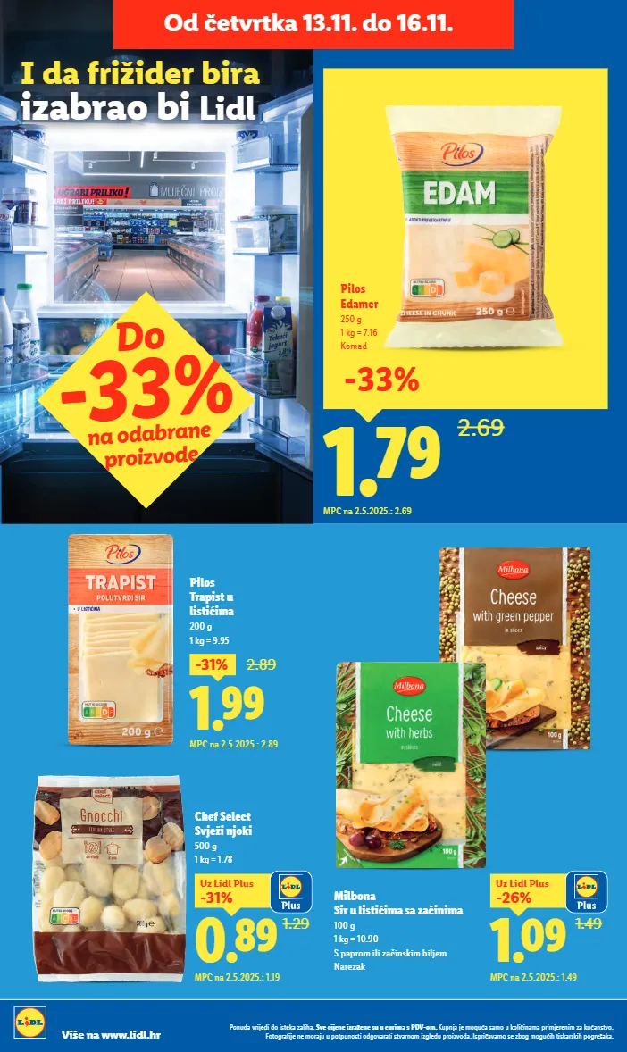 1.79 2.69 pilos edamer 250 g 1 kg = 7.16 komad mpc na 2.5.2025.: 2.69 -33% i da frižider bira izabrao bi lidl do -33% na odabrane proizvode milbona sir u listićima sa začinima 100 g 1 kg = 10.90 s paprom ili začinskim biljem narezak 1.99 -31% 2.89 mpc na 2.5.2025.: 2.89 pilos trapist u listićima 200 g 1 kg = 9.95 1.49 1.09 -26% uz lidl plus mpc na 2.5.2025.: 1.49 chef select svježi njoki 500 g 1 kg = 1.78 1.29 0.89 -31% uz lidl plus mpc na 2.5.2025.: 1.19 ponuda vrijedi do isteka zaliha. sve cijene izražene su u eurima s pdv-om. kupnja je moguća samo u količinama primjerenim za kućanstvo. fotografije ne moraju u potpunosti odgovarati stvarnom izgledu proizvoda. ispričavamo se zbog mogućih tiskarskih pogrešaka. više na www.lidl.hr od četvrtka 13.11. do 16.11.