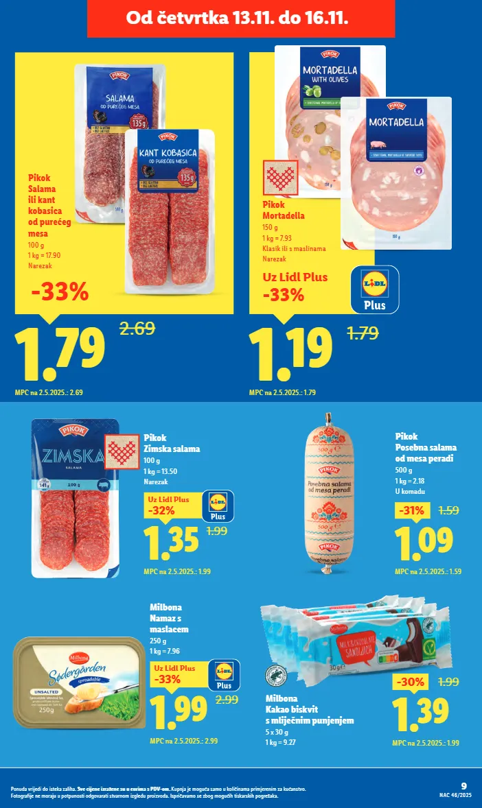 1.79 2.69 pikok salama ili kant kobasica od purećeg mesa 100 g 1 kg = 17.90 narezak mpc na 2.5.2025.: 2.69 -33% 1.39 -30% 1.99 mpc na 2.5.2025.: 1.99 milbona kakao biskvit s mliječnim punjenjem 5 x 30 g 1 kg = 9.27 uz lidl plus -33% 1.19 1.79 pikok mortadella 150 g 1 kg = 7.93 klasik ili s maslinama narezak mpc na 2.5.2025.: 1.79 1.09 -31% 1.59 mpc na 2.5.2025.: 1.59 pikok posebna salama od mesa peradi 500 g 1 kg = 2.18 u komadu 1.99 1.35 -32% uz lidl plus mpc na 2.5.2025.: 1.99 pikok zimska salama 100 g 1 kg = 13.50 narezak milbona namaz s maslacem 250 g 1 kg = 7.96 2.99 1.99 -33% uz lidl plus mpc na 2.5.2025.: 2.99 9 nac 46/2025 ponuda vrijedi do isteka zaliha. sve cijene izražene su u eurima s pdv-om. kupnja je moguća samo u količinama primjerenim za kućanstvo. fotografije ne moraju u potpunosti odgovarati stvarnom izgledu proizvoda. ispričavamo se zbog mogućih tiskarskih pogrešaka. od četvrtka 13.11. do 16.11.