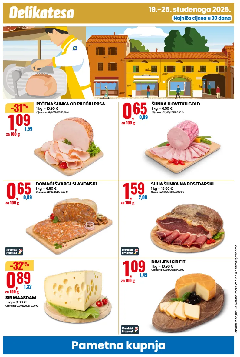pametna kupnja delikatesa 19.-25. studenoga 2025. najniža cijena u 30 dana ponuda iz odjela delikatesa može varirati u nekim trgovinama. šunka u ovitku gold 1 kg = 6,50 € cijena na 02/05/2025: 8,90 € 0 , 65 0,89 za 100 g domaći švargl slavonski 1 kg = 6,50 € cijena na 02/05/2025: 8,90 € 0 , 65 0,89 za 100 g suha šunka na posedarski 1 kg = 15,90 € cijena na 02/05/2025: 20,90 € 1 , 59 2,09 za 100 g dimljeni sir fit 1 kg = 10,90 € cijena na 02/05/2025: 14,90 € 1 , 09 1,49 za 100 g pečena šunka od pilećih prsa 1 kg = 10,90 € cijena na 02/05/2025: 13,90 € 1 , 09 1,59 za 100 g -31 % sir maasdam 1 kg = 8,90 € cijena na 02/05/2025: 13,90 € 0 , 89 1,32 za 100 g -32 %