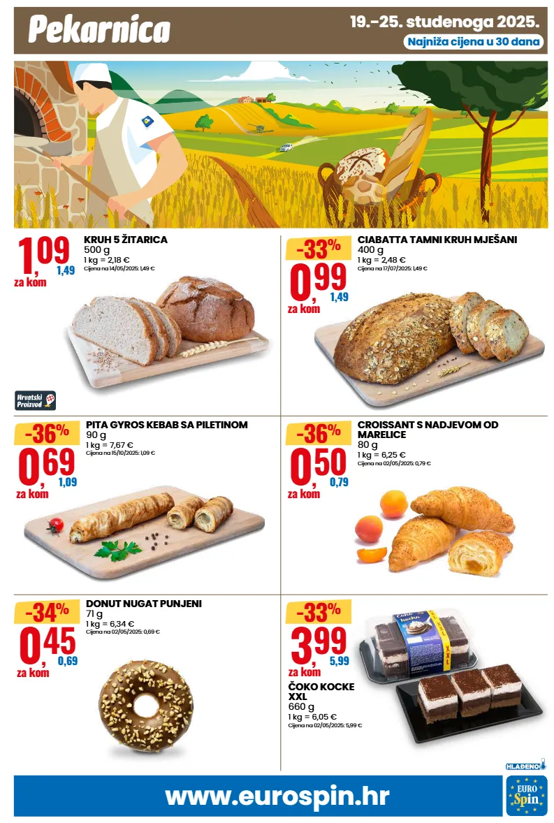 www.eurospin.hr pekarnica 19.-25. studenoga 2025. najniža cijena u 30 dana kruh 5 žitarica 500 g 1 kg = 2,18 € cijena na 14/05/2025: 1,49 € 1 , 09 1,49 za kom croissant s nadjevom od marelice 80 g 1 kg = 6,25 € cijena na 02/05/2025: 0,79 € 0 , 50 0,79 za kom -36 % donut nugat punjeni 71 g 1 kg = 6,34 € cijena na 02/05/2025: 0,69 € 0 , 45 0,69 za kom -34 % čoko kocke xxl 660 g 1 kg = 6,05 € cijena na 02/05/2025: 5,99 € 3 , 99 5,99 za kom -33 % ciabatta tamni kruh mješani 400 g 1 kg = 2,48 € cijena na 17/07/2025: 1,49 € 0 , 99 1,49 za kom -33 % pita gyros kebab sa piletinom 90 g 1 kg = 7,67 € cijena na 15/10/2025: 1,09 € 0 , 69 1,09 za kom -36 %