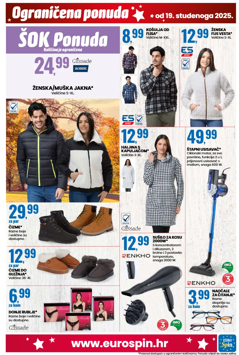 ograničena ponuda www.eurospin.hr *proizvod dostupan u ograničenim količinama. ponuda vrijedi do isteka zaliha. od 19. studenoga 2025. ženska/muška jakna* veličine s-xl. 24 , 99 košulja od flisa* veličine m-xxl. 8 , 99 haljina s kapuljačom* veličine s-xl. 12 , 99 čizme do gležnja* veličine 36-41. 12 , 99 za par čizme* razne boje i veličine su dostupne. 29 , 99 za par donje rublje* razne boje i veličine su dostupne. 6 , 99 za kom naočale za čitanje* razne dioprtije su dostupne. 3 , 99 za kom štapni usisavač* ciklonski motor, za sve površine, funkcija 2 u 1, prijenosni usisavač s metlom, snaga 600 w. 49 , 99 sušilo za kosu 2000w* s koncentratorom i difuzorom, 2 brzine i 3 postavke temperature, snaga 2000 w. 12 , 99 ženska flis vesta* veličine s-xl. 12 , 99