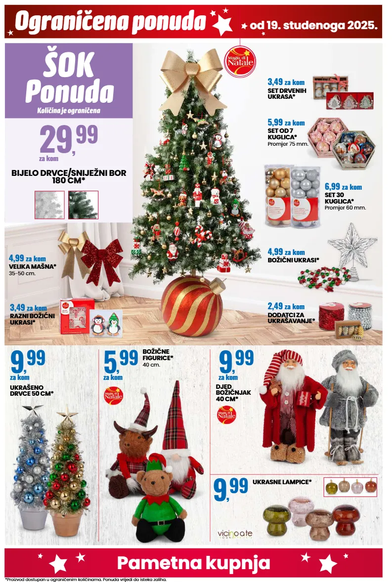 *Proizvod dostupan u ograničenim količinama. Ponuda vrijedi do isteka zaliha. Ograničena ponuda od 19. studenoga 2025. Pametna kupnja 4,99 za kom VELIKA MAŠNA* 35-50 cm. 3,49 za kom SET DRVENIH UKRASA* 6,99 za kom SET 30 KUGLICA* Promjer 60 mm. 5,99 za kom SET OD 7 KUGLICA* Promjer 75 mm. 3,49 za kom RAZNI BOŽIĆNI UKRASI* UKRAŠENO DRVCE 50 CM* 9 , 99 za kom BOŽIČNE FIGURICE* 40 cm. 5 , 99 za kom DJED BOŽIČNJAK 40 CM* 9 , 99 za kom UKRASNE LAMPICE* 9 , 99 4,99 za kom BOŽIČNI UKRASI* 2,49 za kom DODATCI ZA UKRAŠAVANJE* BIJELO DRVCE/SNIJEŽNI BOR 180 CM* 29 , 99 za kom