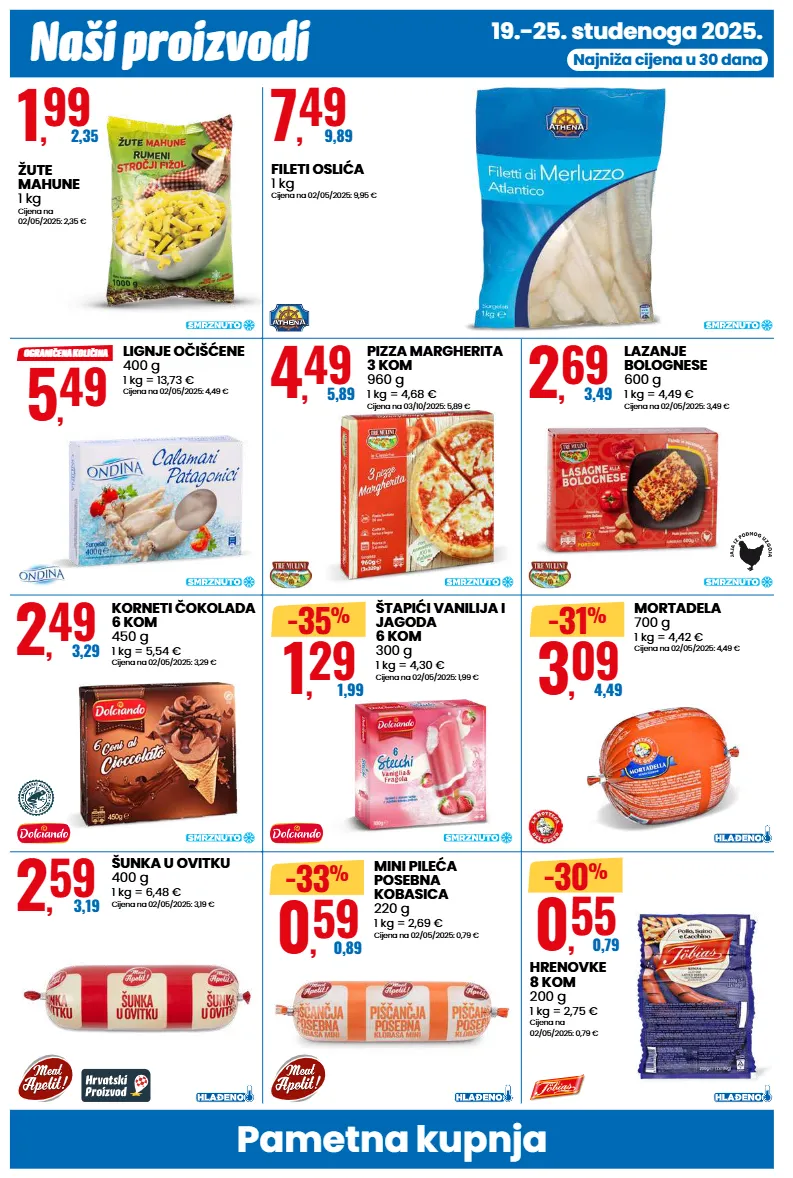 naši proizvodi pametna kupnja 19.-25. studenoga 2025. najniža cijena u 30 dana 1 , 99 2,35 žute mahune 1 kg cijena na 02/05/2025: 2,35 € 7 , 49 9,89 fileti oslića 1 kg cijena na 02/05/2025: 9,95 € 5 , 49 ograničena količina lignje očišćene 400 g 1 kg = 13,73 € cijena na 02/05/2025: 4,49 € 4 , 49 5,89 pizza margherita 3 kom 960 g 1 kg = 4,68 € cijena na 03/10/2025: 5,89 € 2 , 69 3,49 lazanje bolognese 600 g 1 kg = 4,49 € cijena na 02/05/2025: 3,49 € 2 , 49 3,29 korneti čokolada 6 kom 450 g 1 kg = 5,54 € cijena na 02/05/2025: 3,29 € 1 , 29 1,99 -35 % štapići vanilija i jagoda 6 kom 300 g 1 kg = 4,30 € cijena na 02/05/2025: 1,99 € 3 , 09 4,49 -31 % mortadela 700 g 1 kg = 4,42 € cijena na 02/05/2025: 4,49 € 2 , 59 3,19 šunka u ovitku 400 g 1 kg = 6,48 € cijena na 02/05/2025: 3,19 € 0 , 59 0,89 -33 % mini pileća posebna kobasica 220 g 1 kg = 2,69 € cijena na 02/05/2025: 0,79 € 0 , 55 0,79 -30 % hrenovke 8 kom 200 g 1 kg = 2,75 € cijena na 02/05/2025: 0,79 €