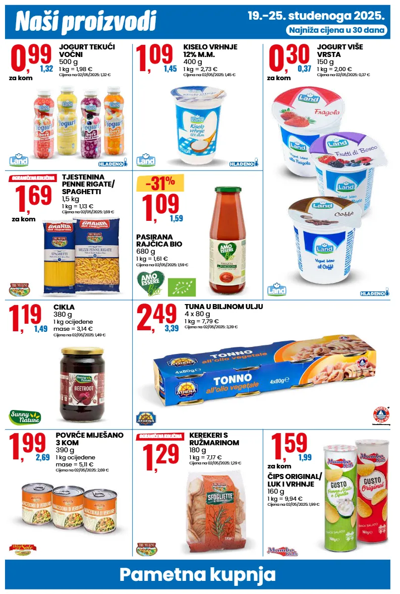 naši proizvodi pametna kupnja 19.-25. studenoga 2025. najniža cijena u 30 dana 0 , 99 1,32 za kom jogurt tekući voćni 500 g 1 kg = 1,98 € cijena na 02/05/2025: 1,32 € 1 , 09 1,45 kiselo vrhnje 12% m.m. 400 g 1 kg = 2,73 € cijena na 02/05/2025: 1,45 € 0 , 30 0,37 za kom jogurt više vrsta 150 g 1 kg = 2,00 € cijena na 02/05/2025: 0,37 € 1 , 69 za kom ograničena količina tjestenina penne rigate/ spaghetti 1,5 kg 1 kg = 1,13 € cijena na 02/05/2025: 1,69 € 1 , 09 1,59 -31 % pasirana rajčica bio 680 g 1 kg = 1,61 € cijena na 02/05/2025: 1,59 € 1 , 19 1,49 cikla 380 g 1 kg ocijeđene mase = 3,14 € cijena na 02/05/2025: 1,49 € 2 , 49 3,39 friendofthesea.org tuna u biljnom ulju 4 x 80 g 1 kg = 7,79 € cijena na 02/05/2025: 3,39 € 1 , 99 2,69 povrće miješano 3 kom 390 g 1 kg ocijeđene mase = 5,11 € cijena na 02/05/2025: 2,69 € 1 , 59 1,99 za kom čips original/ luk i vrhnje 160 g 1 kg = 9,94 € cijena na 02/05/2025: 1,99 € 1 , 29 ograničena količina kerekeri s ružmarinom 180 g 1 kg = 7,17 € cijena na 02/05/2025: 1,29 €