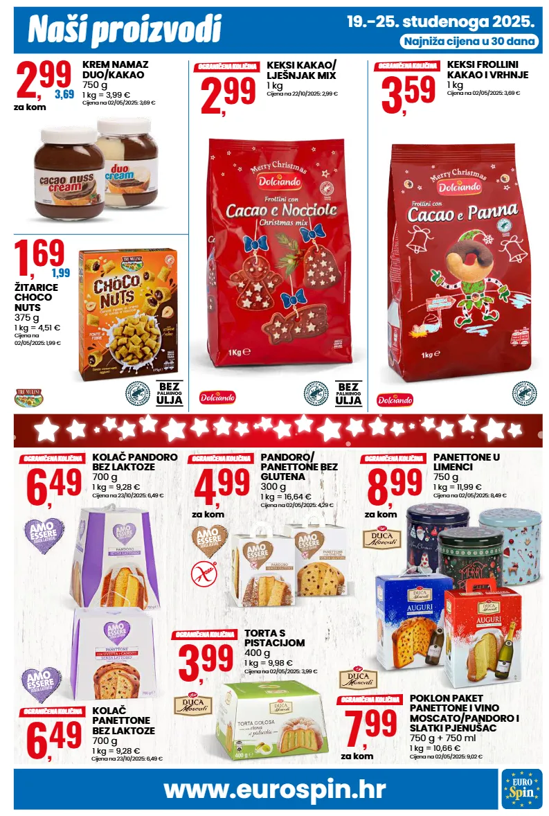 www.eurospin.hr naši proizvodi 19.-25. studenoga 2025. najniža cijena u 30 dana 1 , 69 1,99 žitarice choco nuts 375 g 1 kg = 4,51 € cijena na 02/05/2025: 1,99 € 2 , 99 ograničena količina keksi kakao/ lješnjak mix 1 kg cijena na 22/10/2025: 2,99 € 3 , 59 ograničena količina keksi frollini kakao i vrhnje 1 kg cijena na 02/05/2025: 3,69 € 4 , 99 za kom ograničena količina pandoro/ panettone bez glutena 300 g 1 kg = 16,64 € cijena na 02/05/2025: 4,29 € 2 , 99 3,69 za kom krem namaz duo/kakao 750 g 1 kg = 3,99 € cijena na 02/05/2025: 3,69 € 6 , 49 ograničena količina kolač pandoro bez laktoze 700 g 1 kg = 9,28 € cijena na 23/10/2025: 6,49 € 6 , 49 ograničena količina kolač panettone bez laktoze 700 g 1 kg = 9,28 € cijena na 23/10/2025: 6,49 € 8 , 99 za kom ograničena količina panettone u limenci 750 g 1 kg = 11,99 € cijena na 02/05/2025: 8,49 € 7 , 99 za kom ograničena količina poklon paket panettone i vino moscato/pandoro i slatki pjenušac 750 g + 750 ml 1 kg = 10,66 € cijena na 02/05/2025: 9,02 € 3 , 99 ograničena količina torta s pistacijom 400 g 1 kg = 9,98 € cijena na 02/05/2025: 3,99 €