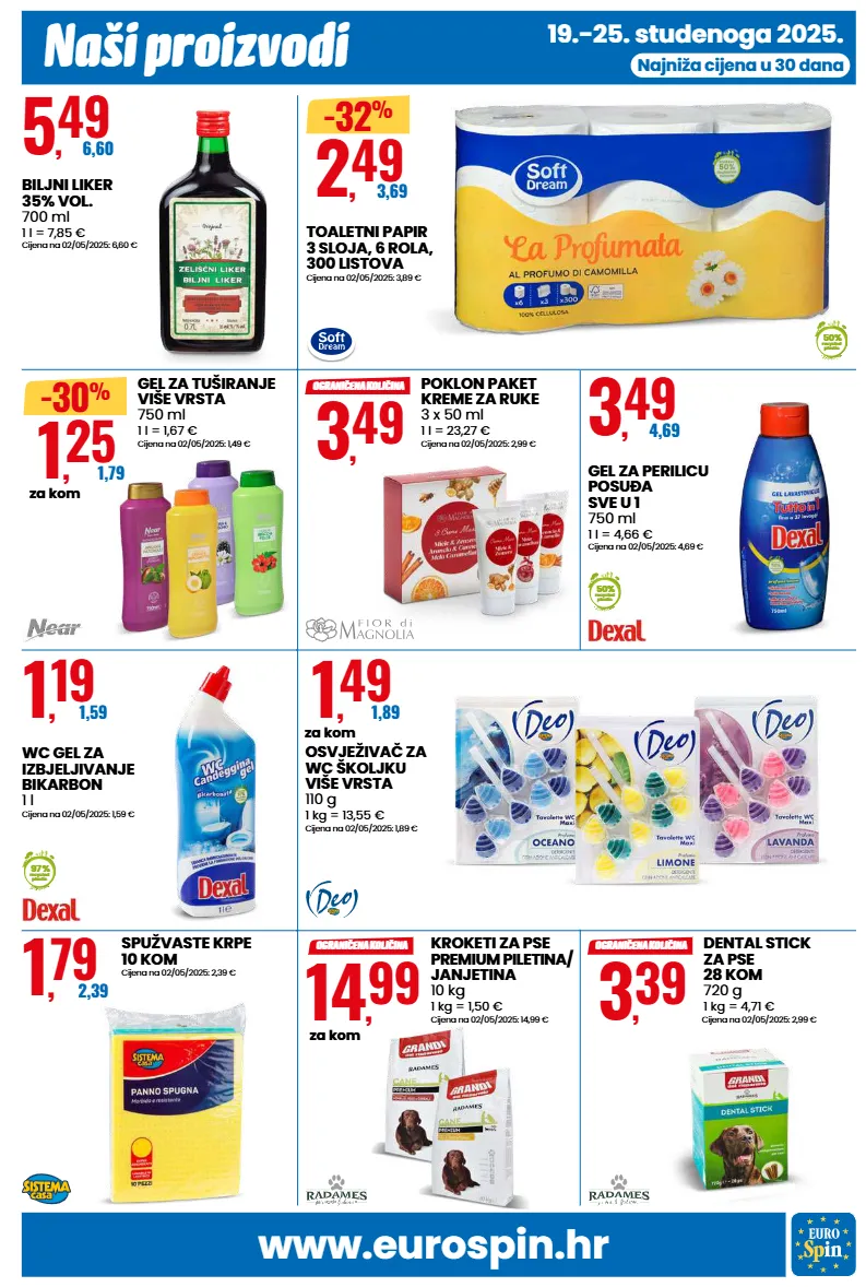 www.eurospin.hr naši proizvodi 19.-25. studenoga 2025. najniža cijena u 30 dana 5 , 49 6,60 biljni liker 35% vol. 700 ml 1 l = 7,85 € cijena na 02/05/2025: 6,60 € 2 , 49 3,69 50% recycled plastic -32 % toaletni papir 3 sloja, 6 rola, 300 listova cijena na 02/05/2025: 3,89 € 1 , 25 1,79 za kom -30 % gel za tuširanje više vrsta 750 ml 1 l = 1,67 € cijena na 02/05/2025: 1,49 € 3 , 49 4,69 50% recycled plastic gel za perilicu posuđa sve u 1 750 ml 1 l = 4,66 € cijena na 02/05/2025: 4,69 € 1 , 19 1,59 97 % recycled plastic wc gel za izbjeljivanje bikarbon 1 l cijena na 02/05/2025: 1,59 € 1 , 49 1,89 za kom osvježivač za wc školjku više vrsta 110 g 1 kg = 13,55 € cijena na 02/05/2025: 1,89 € 1 , 79 2,39 spužvaste krpe 10 kom cijena na 02/05/2025: 2,39 € 3 , 49 ograničena količina poklon paket kreme za ruke 3 x 50 ml 1 l = 23,27 € cijena na 02/05/2025: 2,99 € 14 , 99 za kom ograničena količina kroketi za pse premium piletina/ janjetina 10 kg 1 kg = 1,50 € cijena na 02/05/2025: 14,99 € 3 , 39 ograničena količina dental stick za pse 28 kom 720 g 1 kg = 4,71 € cijena na 02/05/2025: 2,99 €