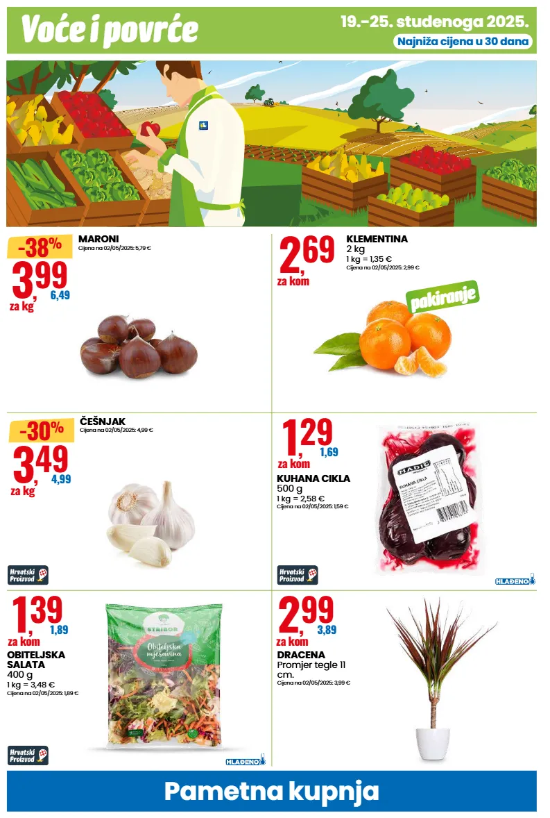pametna kupnja voće i povrće 19.-25. studenoga 2025. najniža cijena u 30 dana klementina 2 kg 1 kg = 1,35 € cijena na 02/05/2025: 2,99 € pakiranje 2 , 69 za kom dracena promjer tegle 11 cm. cijena na 02/05/2025: 3,99 € 2 , 99 3,89 za kom maroni cijena na 02/05/2025: 5,79 € 3 , 99 6,49 za kg -38 % kuhana cikla 500 g 1 kg = 2,58 € cijena na 02/05/2025: 1,59 € 1 , 29 1,69 za kom češnjak cijena na 02/05/2025: 4,99 € 3 , 49 4,99 za kg -30 % obiteljska salata 400 g 1 kg = 3,48 € cijena na 02/05/2025: 1,89 € 1 , 39 1,89 za kom