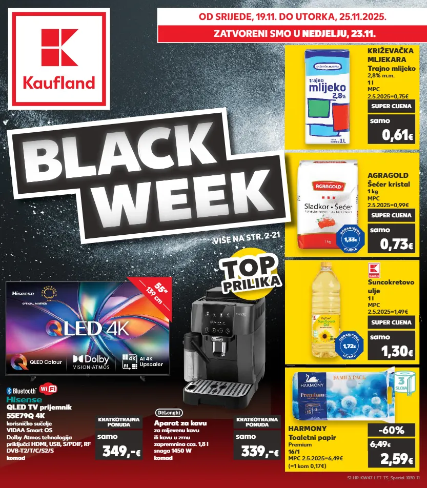 više na str. 2-21 kratkotrajna ponuda kratkotrajna ponuda kratkotrajna ponuda samo kratkotrajna ponuda od srijede, 19.11. do utorka, 25.11.2025. zatvoreni smo u nedjelju, 23.11. više na str. 2-21 bl a c a c a k week agragold šećer kristal 1 kg mpc 2.5.2025=0,99€ križevačka mljekara trajno mlijeko 2,8% m.m. 1 l mpc 2.5.2025=0,75€ suncokretovo ulje 1 l mpc 2.5.2025=1,49€ aparat za kavu za mljevenu kavu ili kavu u zrnu zapremnina cca. 1,8 l snaga 1450 w komad qled tv prijemnik 55e79q 4k korisničko sučelje vidaa smart os dolby atmos tehnologija priključci hdmi, usb, s/pdif, rf dvb-t2/t/c/s2/s komad harmony toaletni papir premium 16/1 mpc 2.5.2025=6,49€ (=1 kom 0,17€) samo super cijena 0,73 € samo super cijena 0,61 € kratkotrajna ponuda samo 339,- € kratkotrajna ponuda samo 349,- € -60% 2,59 € 6,49 € samo super cijena 1,30 € 1,72 € 1,33 € top top top top prilik a prilika 3 sloja 55“ 139 cm s1-hr-kw47-lft-ts_special-1030-11