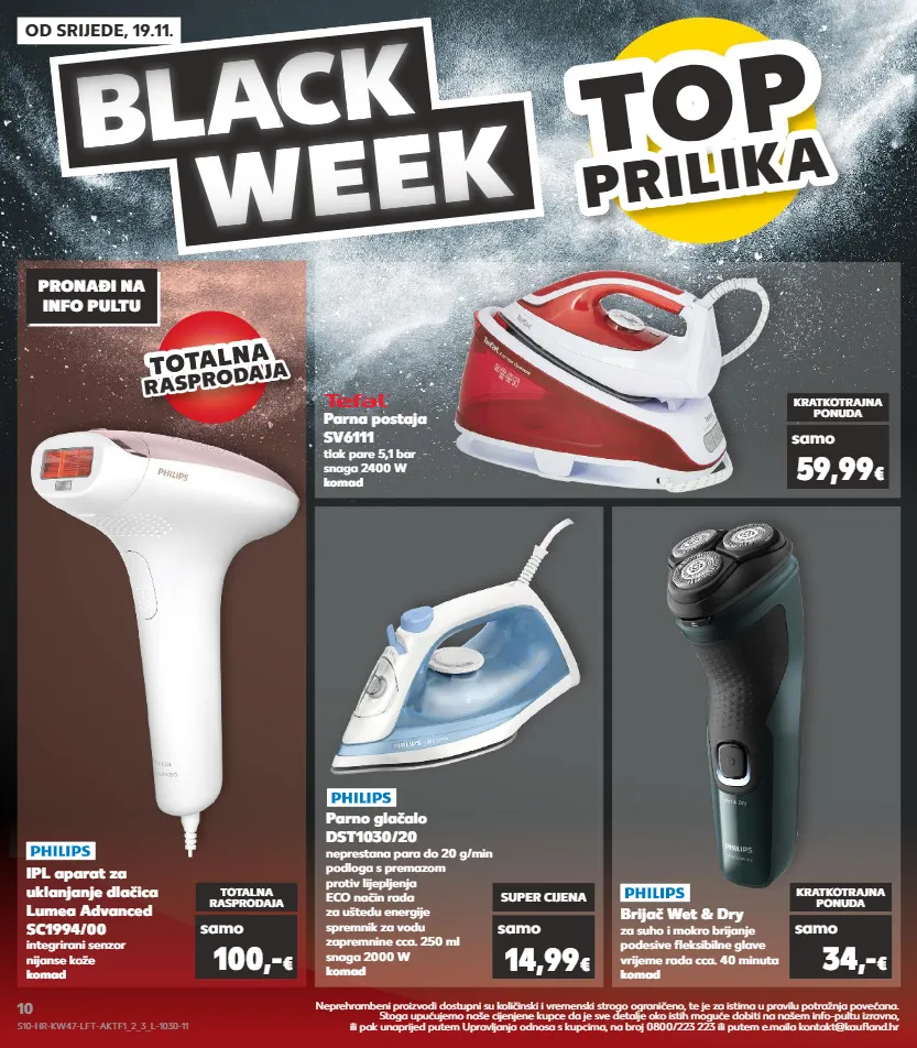 kratkotrajna ponuda od srijede, 19.11. bl a c a c a k week top top top top prilik a prilika ipl aparat za uklanjanje dlačica lumea advanced sc1994/00 integrirani senzor nijanse kože komad totalna rasprodaja samo 100,- € brijač wet & dry za suho i mokro brijanje podesive fleksibilne glave vrijeme rada cca. 40 minuta komad kratkotrajna ponuda samo 34,- € parna postaja sv6111 tlak pare 5,1 bar snaga 2400 w komad kratkotrajna ponuda samo 59,99 € parno glačalo dst1030/20 neprestana para do 20 g/min podloga s premazom protiv lijepljenja eco način rada za uštedu energije spremnik za vodu zapremnine cca. 250 ml snaga 2000 w komad samo super cijena 14,99 € pronađi na info pultu totalna totalna r a spr od aj a rasprodaja neprehrambeni proizvodi dostupni su količinski i vremenski strogo ograničeno, te je za istima u pravilu potražnja povećana. stoga upućujemo naše cijenjene kupce da je sve detalje oko istih moguće dobiti na našem info-pultu izravno, ili pak unaprijed putem upravljanja odnosa s kupcima, na broj 0800/223 223 ili putem e.maila kontakt@kaufland.hr s10-hr-kw47-lft-aktf1_2_3_l-1030-11 10